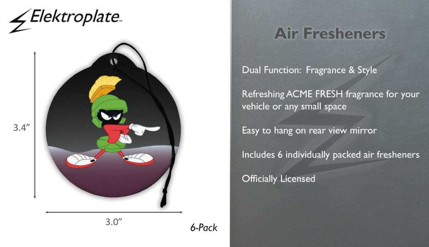 Elektroplate presents a new line of high-quality decorative air fresheners. Enjoy a fresh scent while displaying your style. Officially licensed – Full Color Looney Tunes Air Fresheners (3.4” x 3.0”) in ACME Fresh scent.