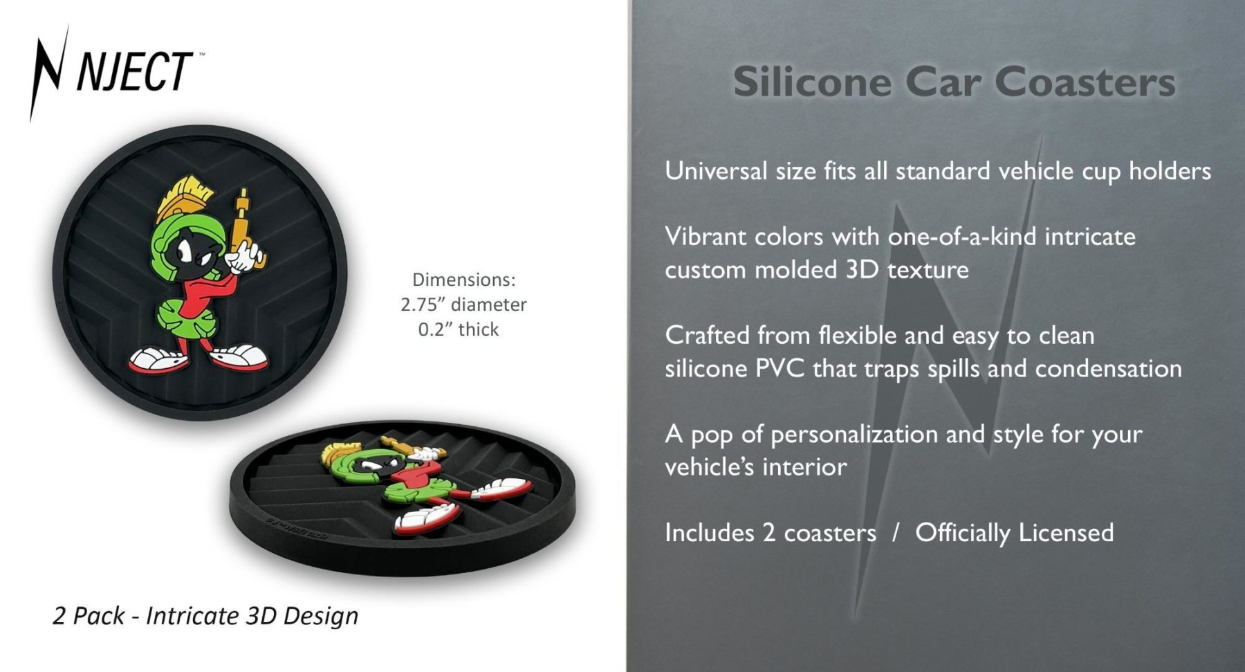 This 2-pack of silicone car coasters features a Marvin the Martian design with intricate custom molded 3D texture and bold color contrast. The raised detailing adds depth, durability, and visual impact while providing a pop of personality and style to your vehicle’s interior. Designed for everyday use, these silicone cup holder coasters combine functional protection with iconic cartoon flair in a durable automotive accessory.