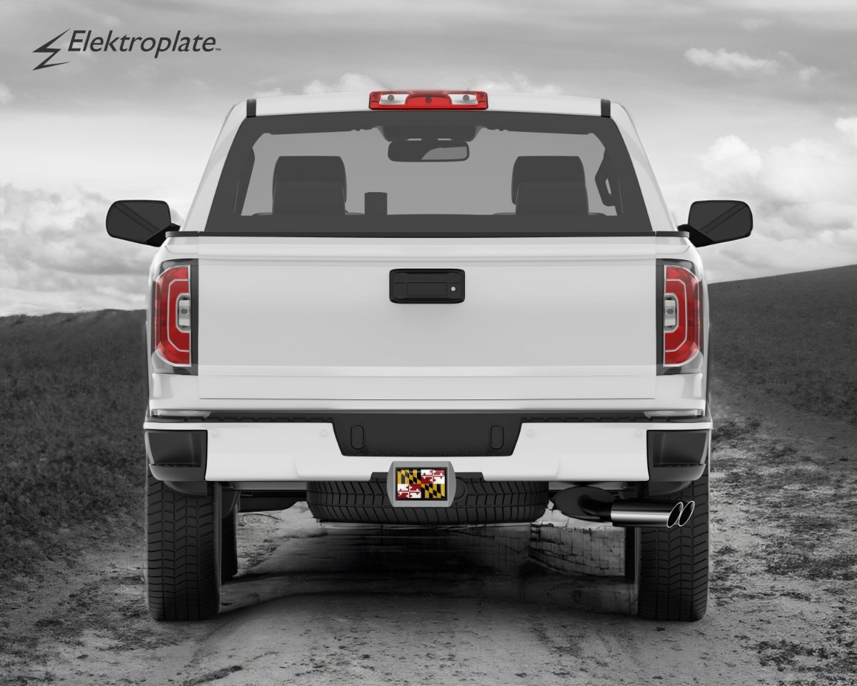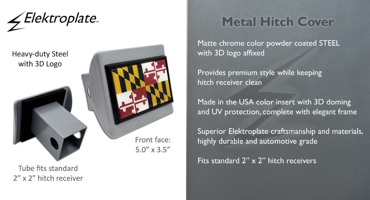 Maryland State Flag ALL-METAL hitch cover (front plate is 5” x 3.5”) by Elektroplate. A step above in quality and appearance over cheaper plastic and pewter versions. Comprised of OEM (ABS plastic core with a chrome-plated metal finish) Maryland emblem adhered to a brushed chrome all-metal hitch cover mount. The hitch cover fits standard 2” trailer hitch receivers (if it does not fit perfectly, you may return it for a full refund).