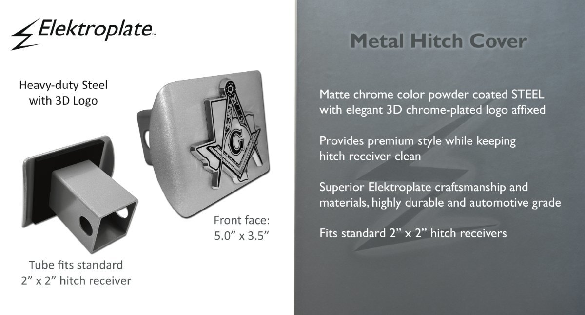 Proudly display your Texas Masonic heritage with this Mason (Texas) all-metal hitch cover by Elektroplate. Featuring a chrome-plated Mason emblem mounted on a brushed all-metal hitch plate measuring 5” x 3.5”, this premium accessory offers both bold style and exceptional durability. It’s designed to fit all standard 2” trailer hitch receivers, and if it doesn’t fit perfectly, you may return it for a full refund.