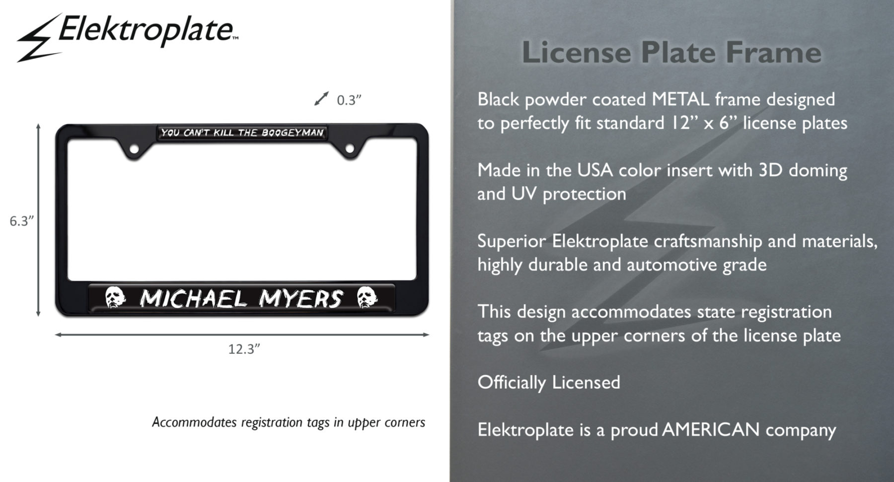 Elevate your vehicle’s style with this Officially Licensed Halloween Michael Myers Boogeyman black powder coated metal license plate frame (12.3" x 6.3") by Elektroplate. This high-quality all-metal frame is built to endure the elements, ensuring it remains looking brand new for years without chipping or fading. The frame features Made in the USA graphic inserts with 3D doming, vivid colors, and UV protection.