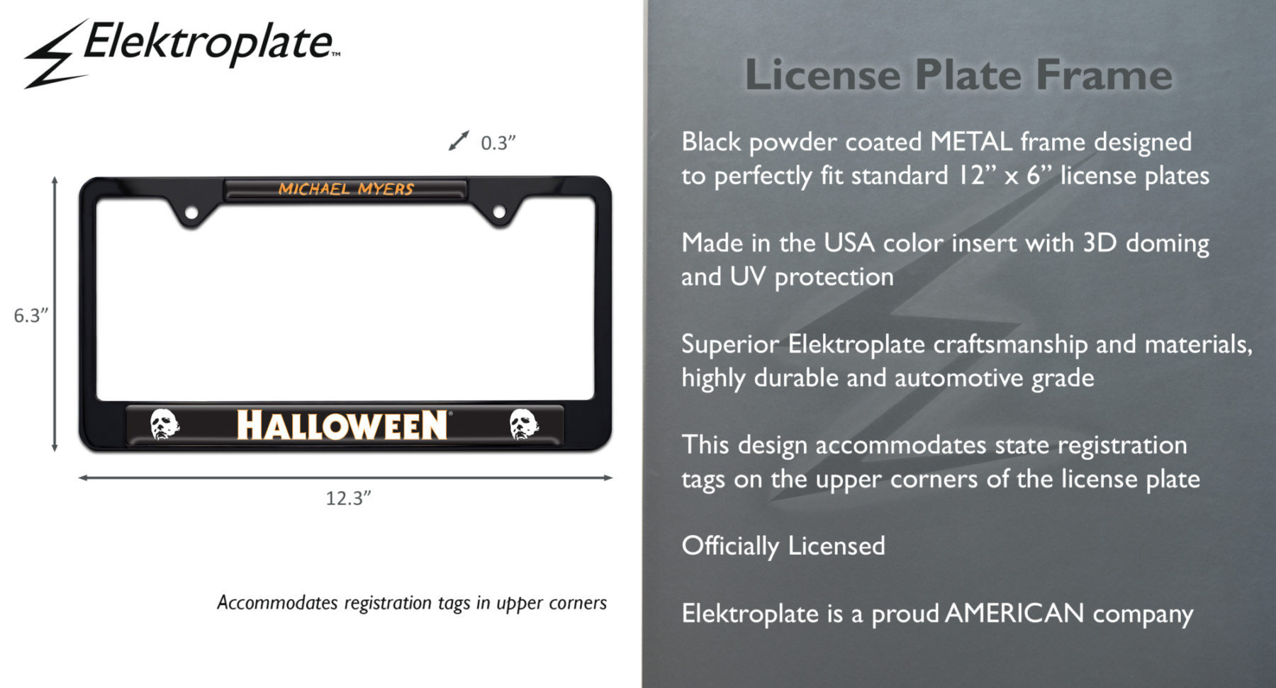 Elevate your vehicle’s style with this Officially Licensed Halloween's Michael Myers black powder coated metal license plate frame (12.3" x 6.3") by Elektroplate. This high-quality all-metal frame is built to endure the elements, ensuring it remains looking brand new for years without chipping or fading. The frame features Made in the USA graphic inserts with 3D doming, vivid colors, and UV protection.