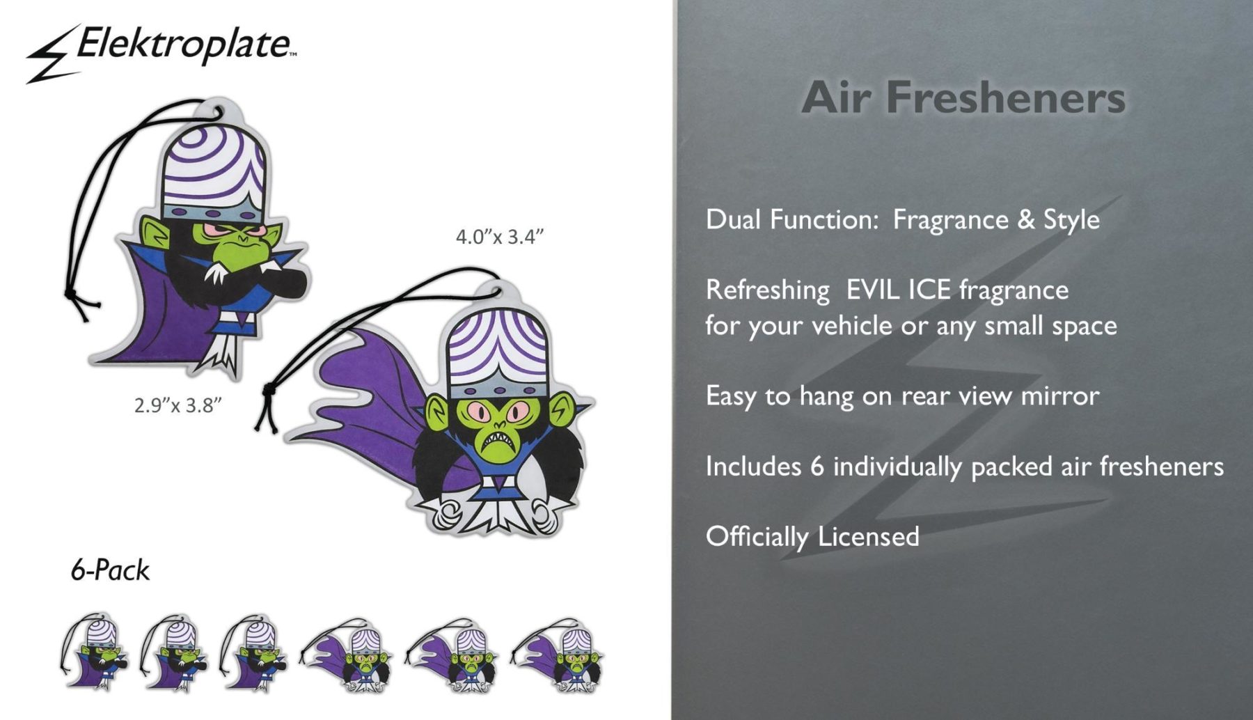 Bring a bold edge to your space with the Elektroplate Mojo Jojo Air Freshener 6-Pack in Evil Ice. Featuring officially licensed designs of the iconic villain, this set combines striking character artwork with a crisp, refreshing fragrance for your vehicle or small space. The Evil Ice scent delivers a cool blend of musk, sandalwood, and amber, helping eliminate odors while creating a clean, modern atmosphere. Easy to hang from your rearview mirror, each air freshener adds a unique and playful statement.