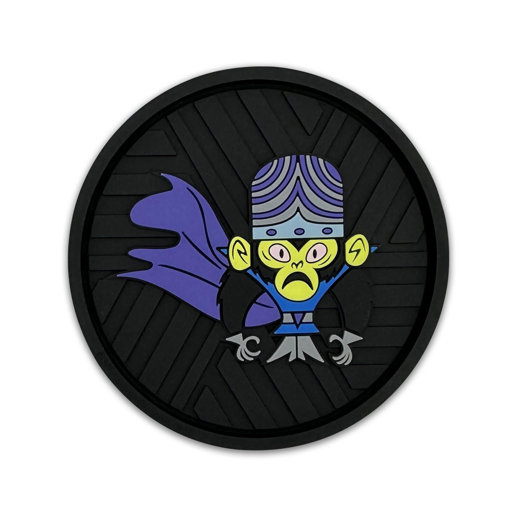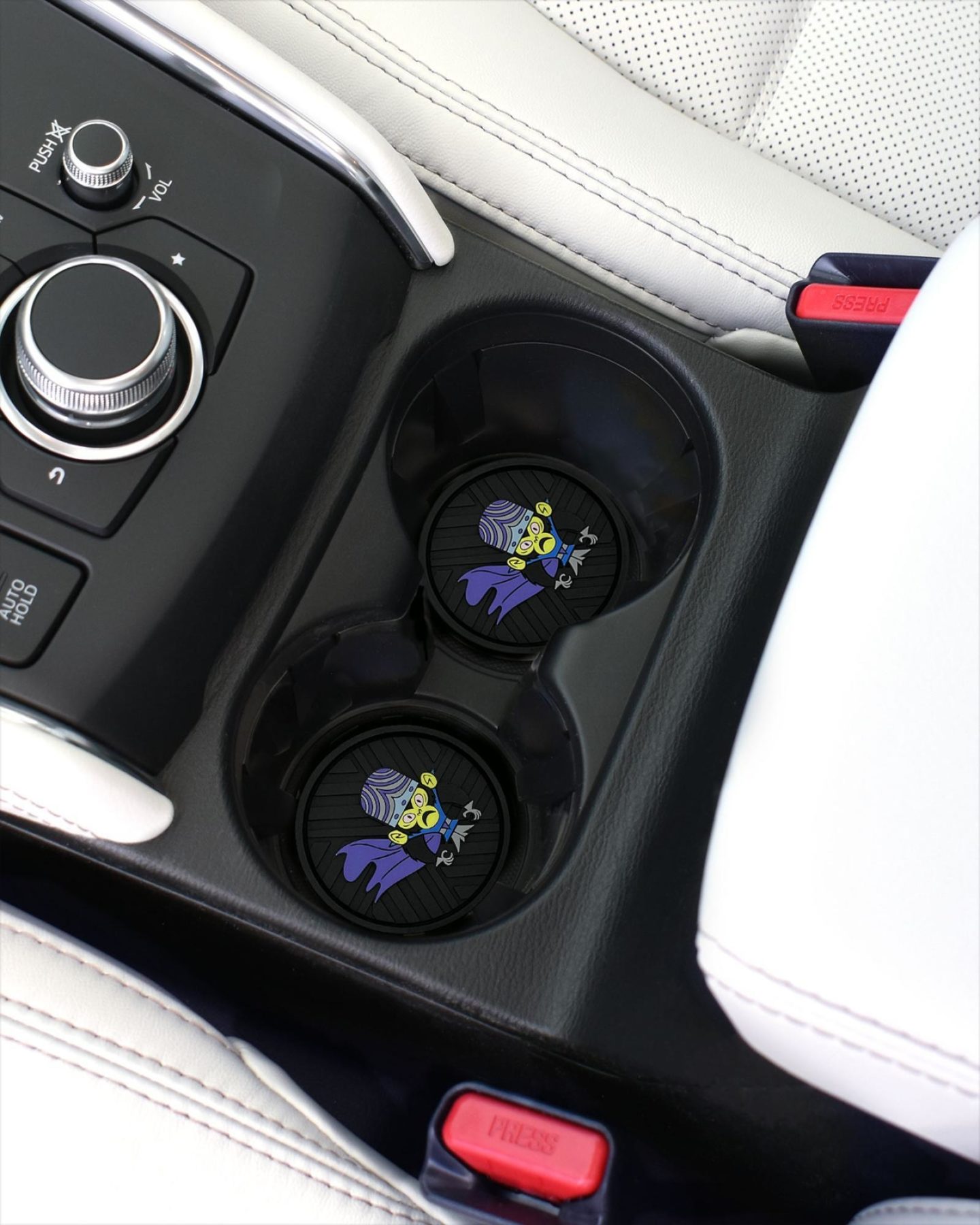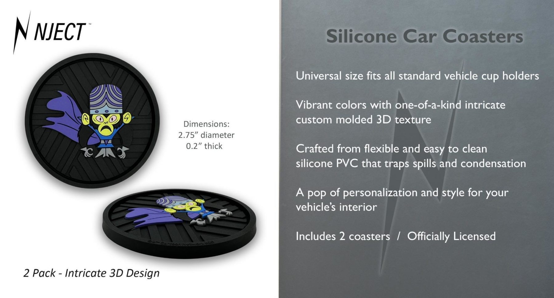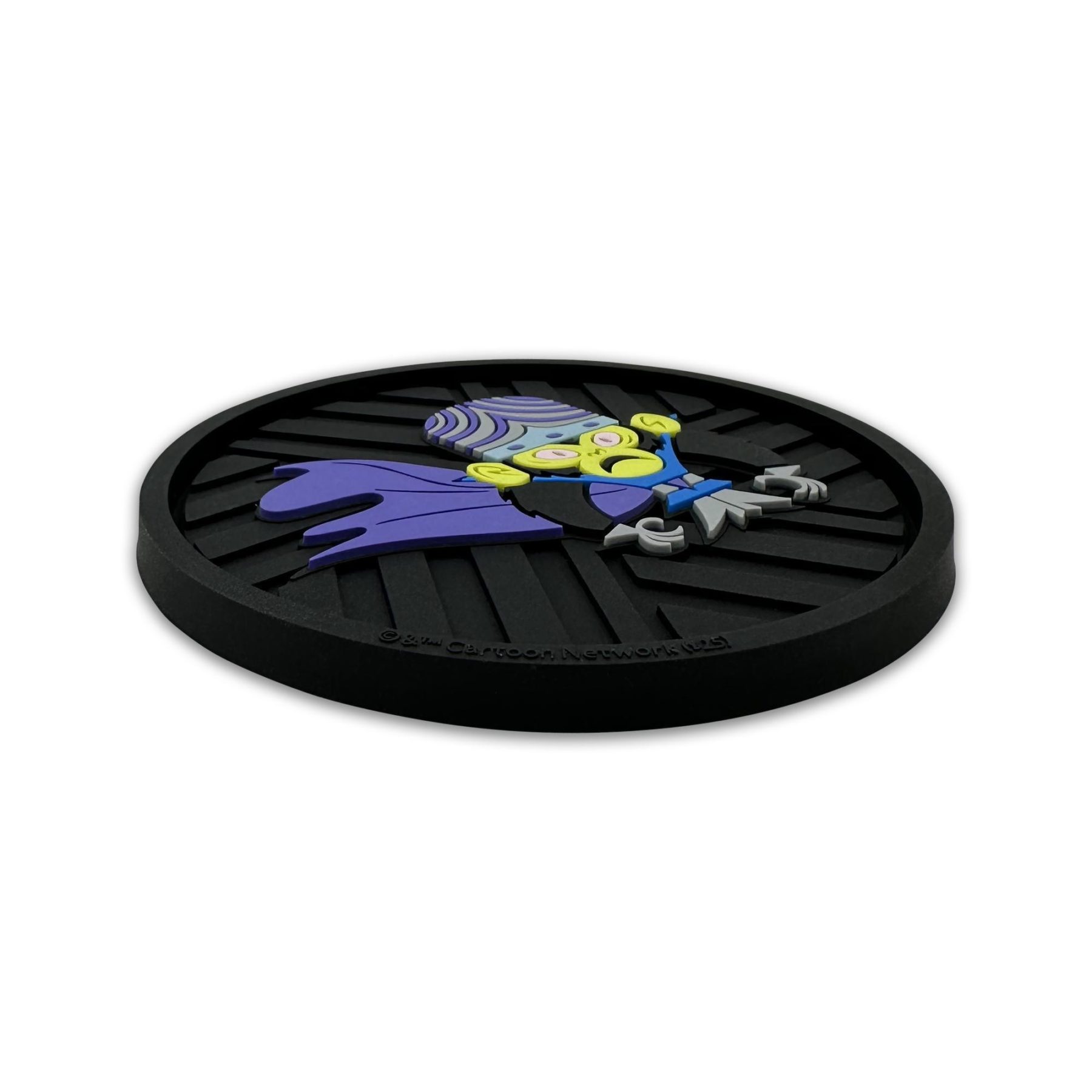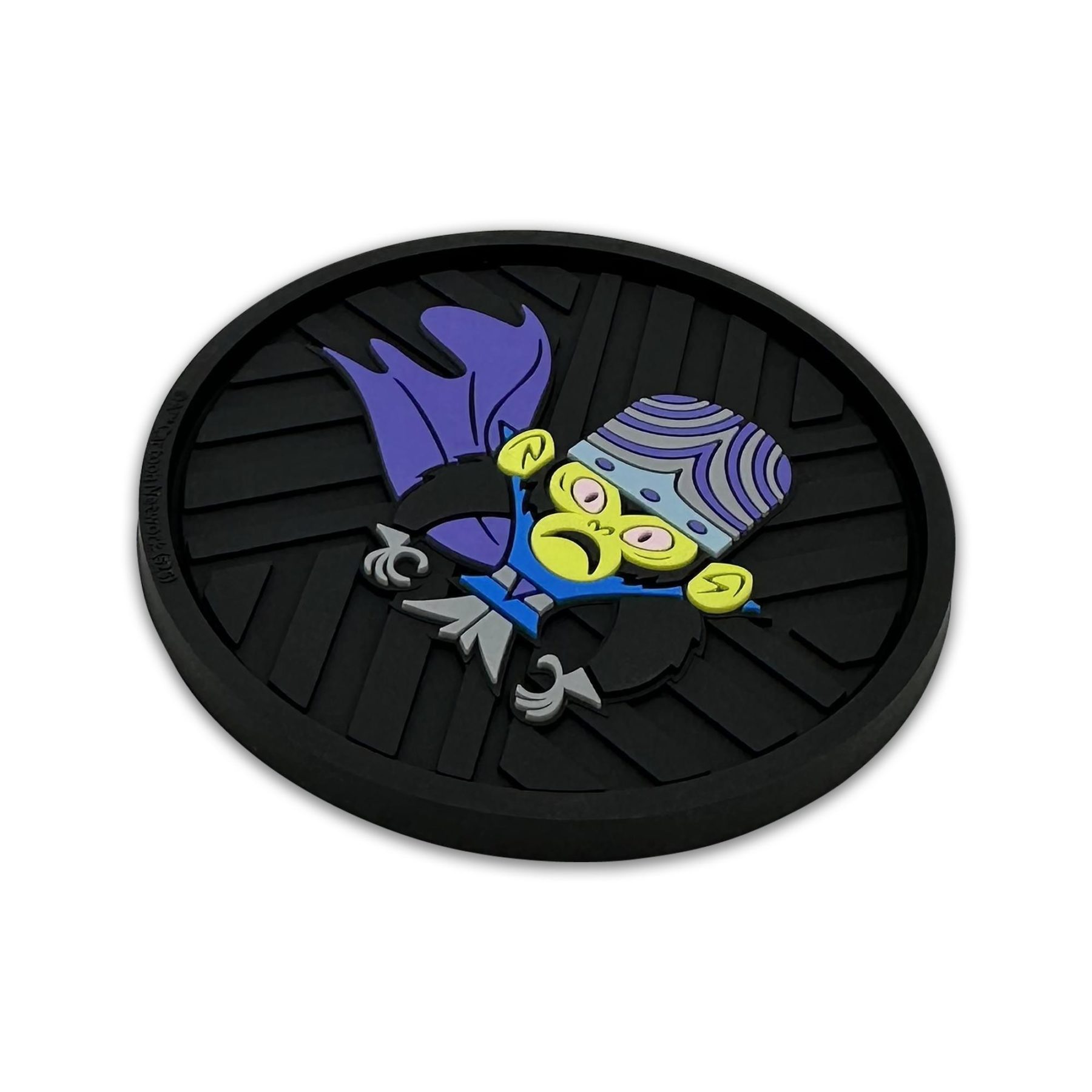 This 2-pack of silicone car coasters features a Mojo Jojo design with intricate custom molded 3D texture and bold color contrast. The raised detailing adds depth, durability, and visual impact while providing a pop of personality and style to your vehicle’s interior. Designed for everyday use, these silicone cup holder coasters combine functional protection with iconic Powerpuff Girls flair in a durable automotive accessory.