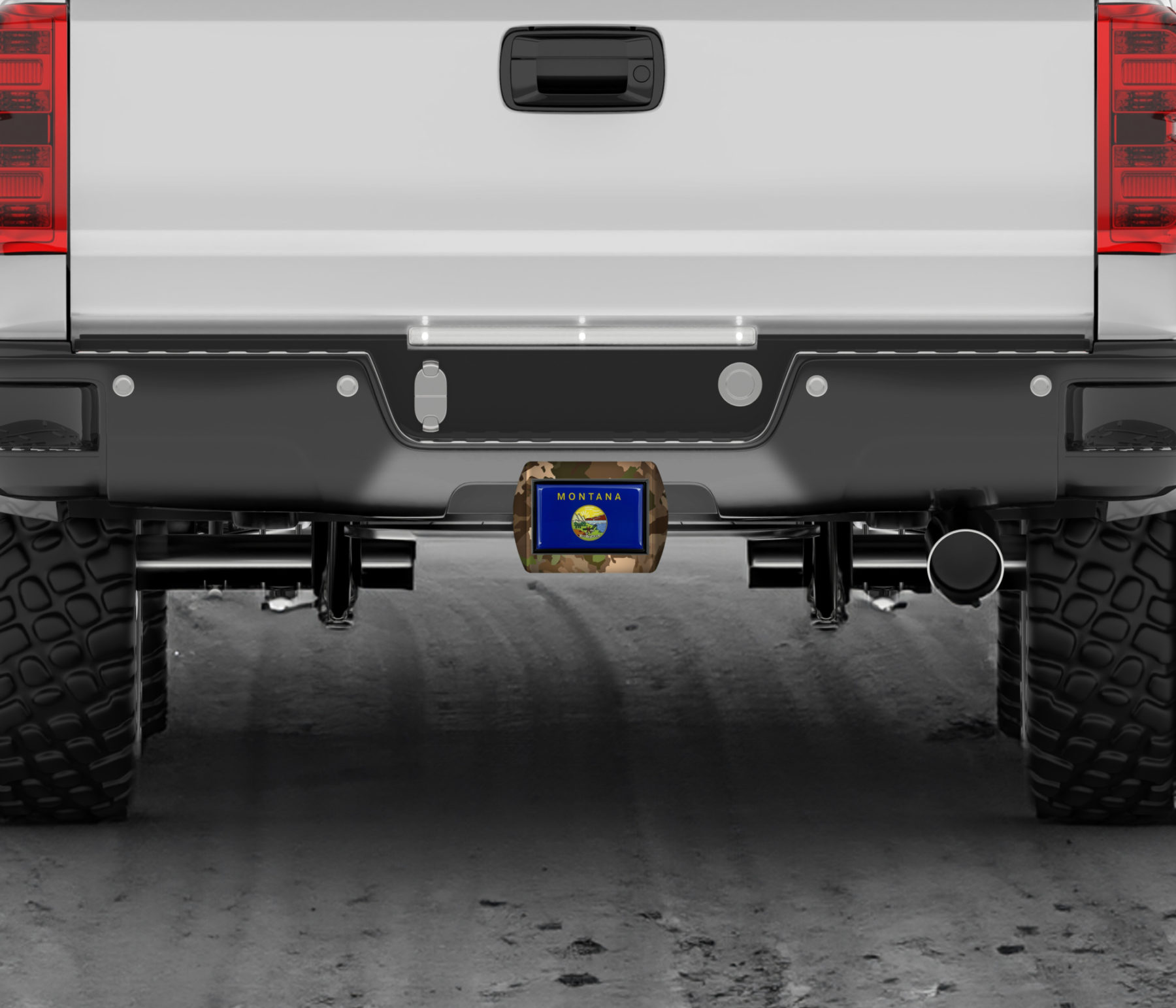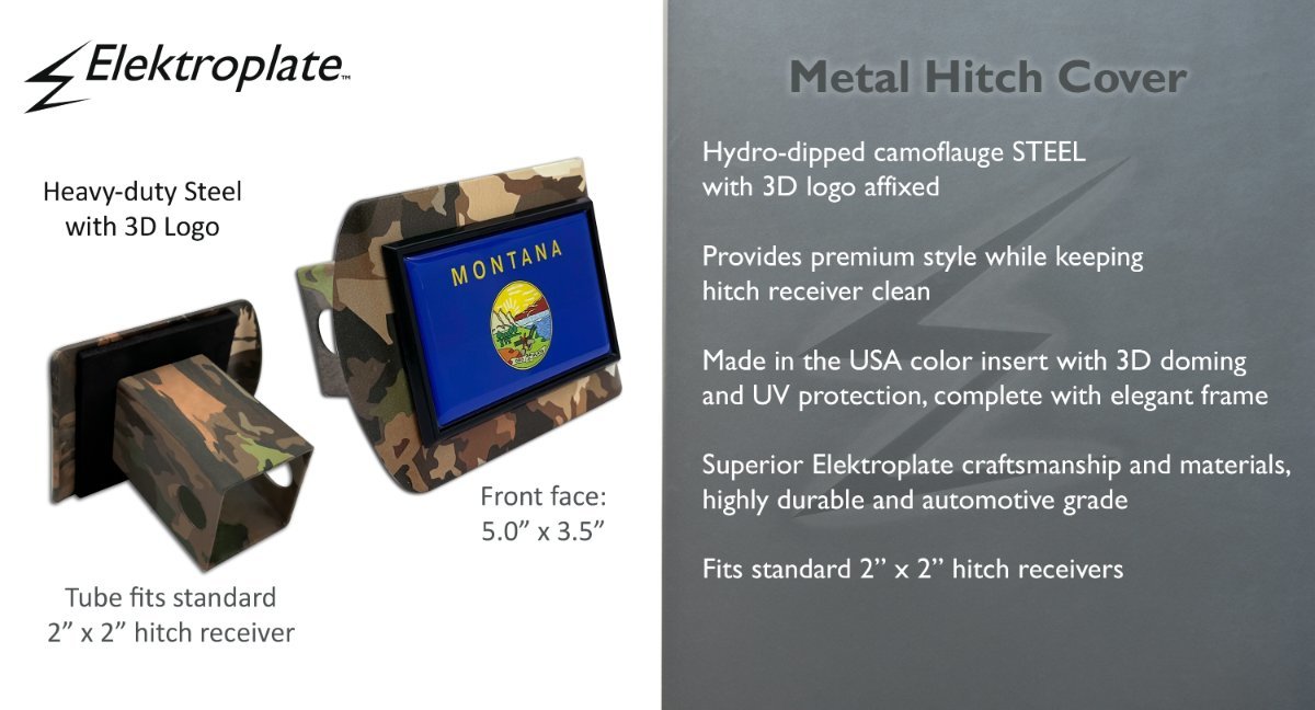 Montana State Flag ALL-METAL hitch cover (front plate is 5” x 3.5”) by Elektroplate. A step above in quality and appearance over cheaper plastic and pewter versions. Comprised of OEM (ABS plastic core with a chrome-plated metal finish) Montana emblem adhered to a Camouflage all-metal hitch cover mount. The hitch cover fits standard 2” trailer hitch receivers (if it does not fit perfectly, you may return it for a full refund).