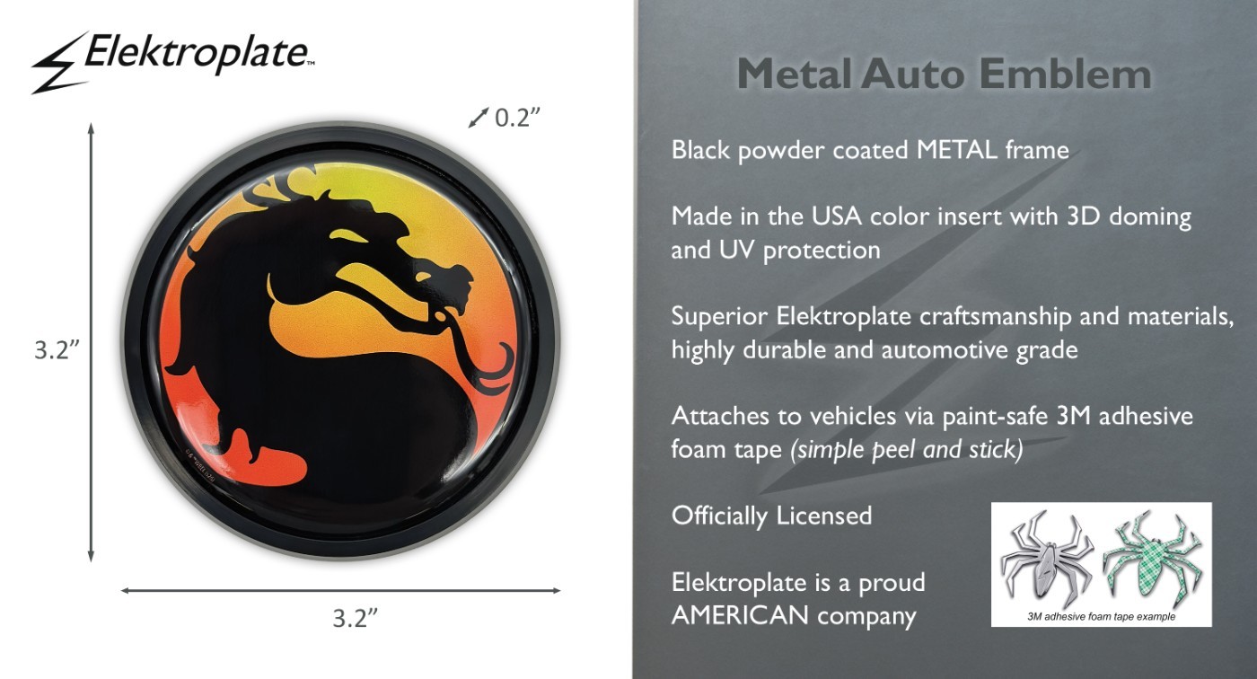 Add a touch of attitude with this Mortal Kombat Dragon black auto emblem (3.2" diameter) by Elektroplate. The perfect size for cars, trucks, and SUVs! All-metal (not plastic) with a powder coated frame and a full-color domed decal insert. The decal is UV-protected, scratch-resistant made to withstand any outdoor conditions. The emblem attaches via paint-safe 3M adhesive foam tape. Our high-end auto emblems are a great way to showcase your favorite gaming series everywhere you drive. In addition, all Elektroplate chrome emblems are packaged in elegant retail packaging to make a great gift!