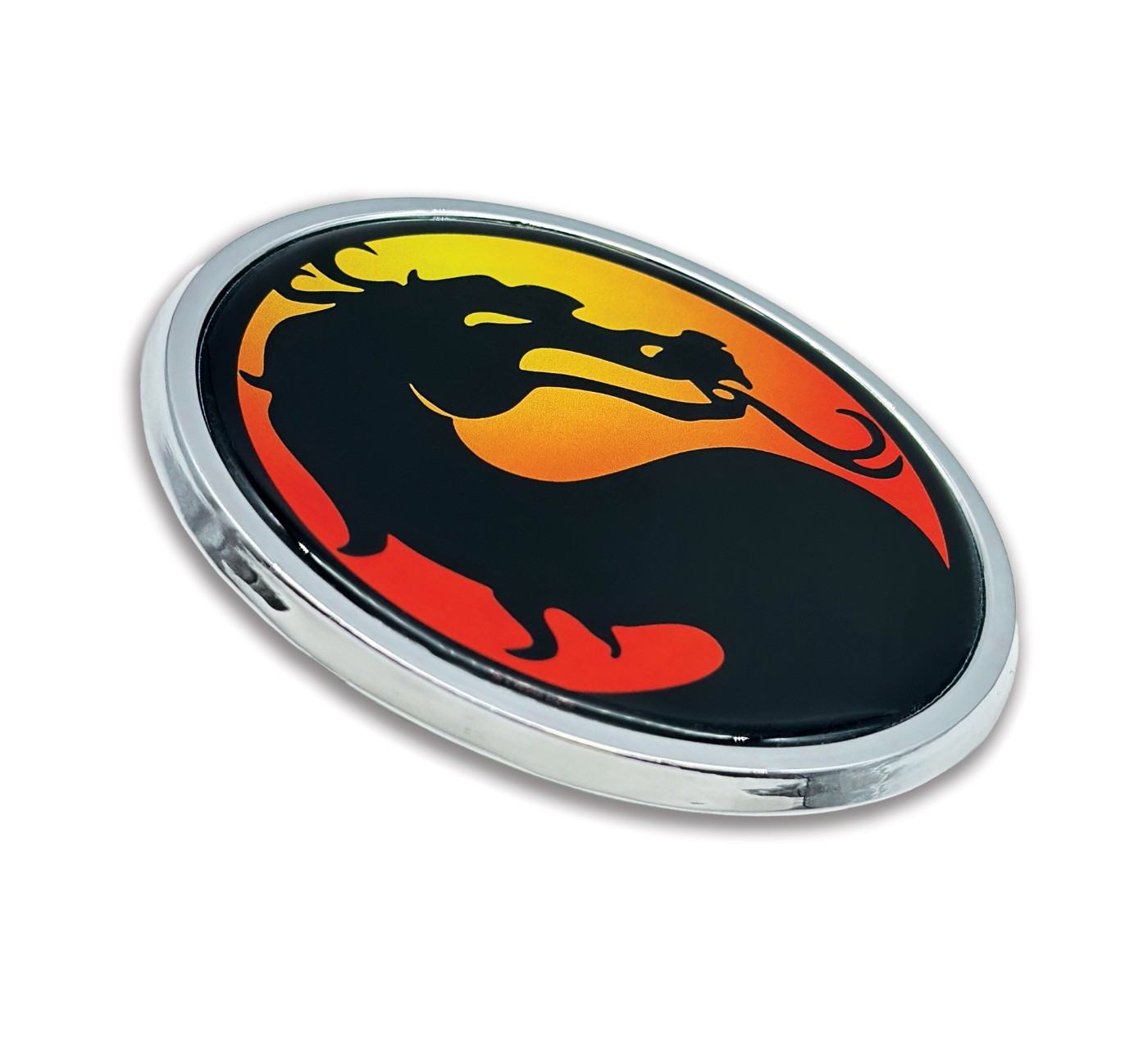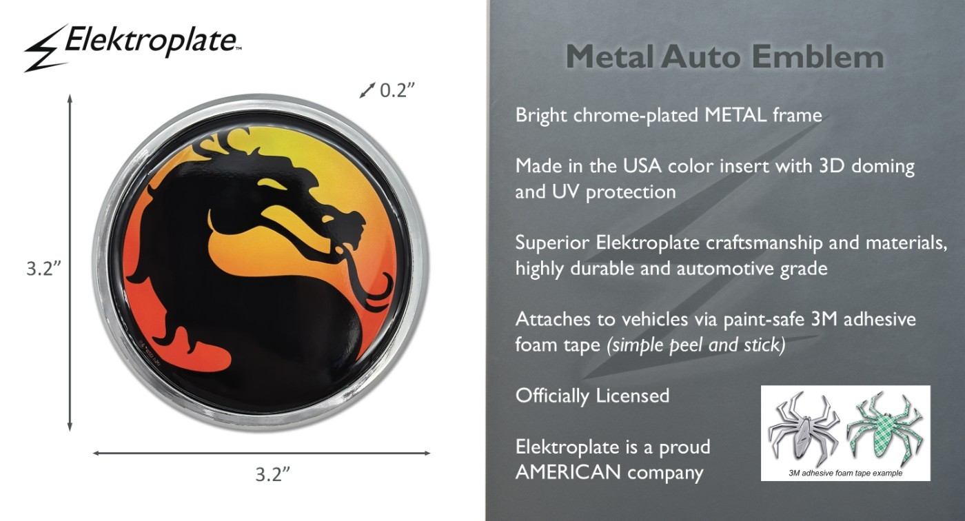 Add a touch of attitude with this Mortal Kombat Dragon shiny chrome auto emblem (3.2" diameter) by Elektroplate. The perfect size for cars, trucks, and SUVs! All-metal (not plastic) with a chrome-plated frame and a full-color domed decal insert. The decal is UV-protected, scratch-resistant made to withstand any outdoor conditions. The emblem attaches via paint-safe 3M adhesive foam tape. Our high-end auto emblems are a great way to showcase your favorite gaming series everywhere you drive. In addition, all Elektroplate chrome emblems are packaged in elegant retail packaging to make a great gift!