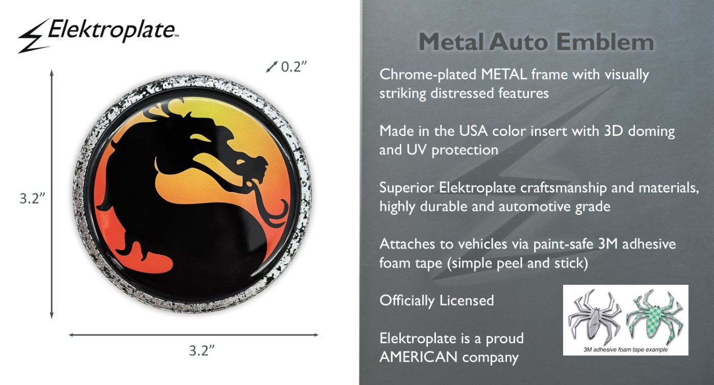 Add a touch of attitude with this Mortal Kombat Dragon distressed chrome auto emblem (3.2" diameter) by Elektroplate. The perfect size for cars, trucks, and SUVs! All-metal (not plastic) with a chrome-plated frame and a full-color domed decal insert. The decal is UV-protected, scratch-resistant made to withstand any outdoor conditions. The emblem attaches via paint-safe 3M adhesive foam tape. Our high-end auto emblems are a great way to showcase your favorite gaming series everywhere you drive. In addition, all Elektroplate chrome emblems are packaged in elegant retail packaging to make a great gift!