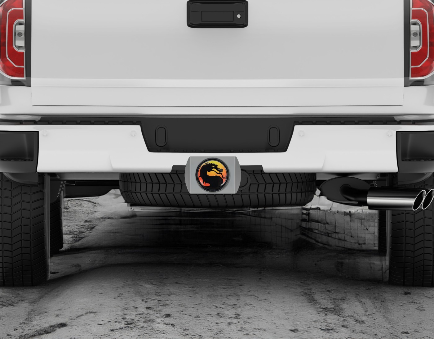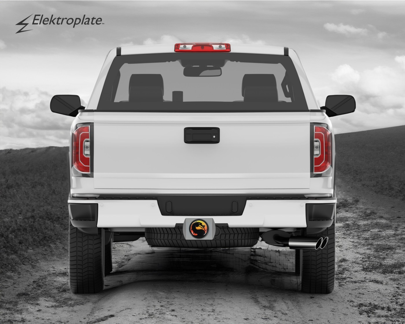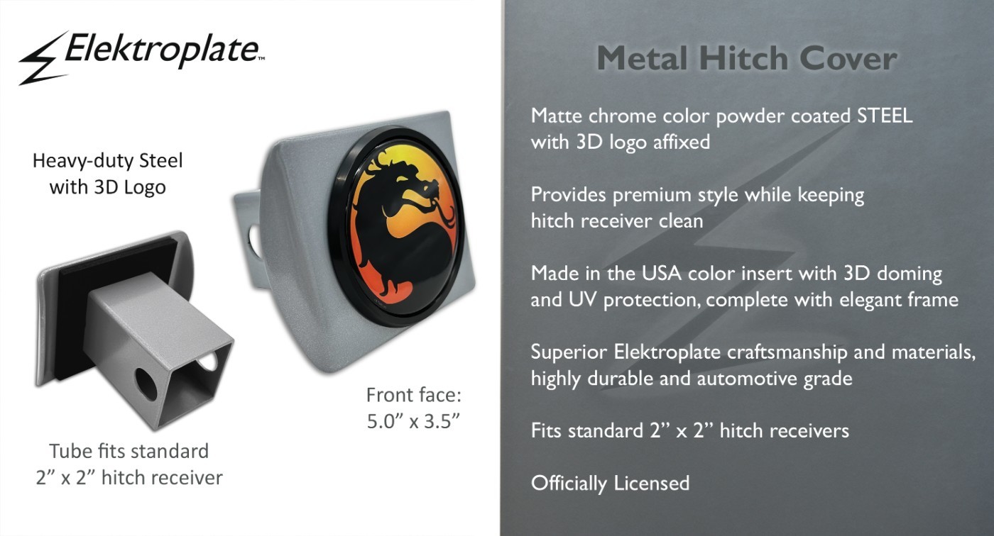 Level up your ride with this officially licensed Mortal Kombat Metal Hitch Cover by Elektroplate. Built from heavy-duty steel with a sleek matte chrome color powder coated finish, it features a bold dragon logo that brings serious Kombat energy to your vehicle. The USA-made insert includes UV-protected domed graphics to keep colors sharp and fade-free, while the durable design helps keep your hitch receiver clean and protected.