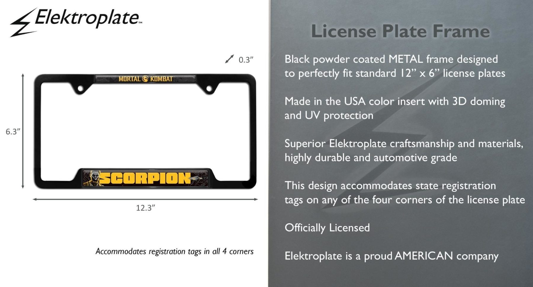 Designed with durability in mind, this open style frame allows registration tags to remain visible on the upper corners while maintaining a clean, modern look. Built from automotive grade materials, it is perfect for everyday use. A great addition for gamers and collectors, this frame adds unmistakable Mortal Kombat style to your ride.
