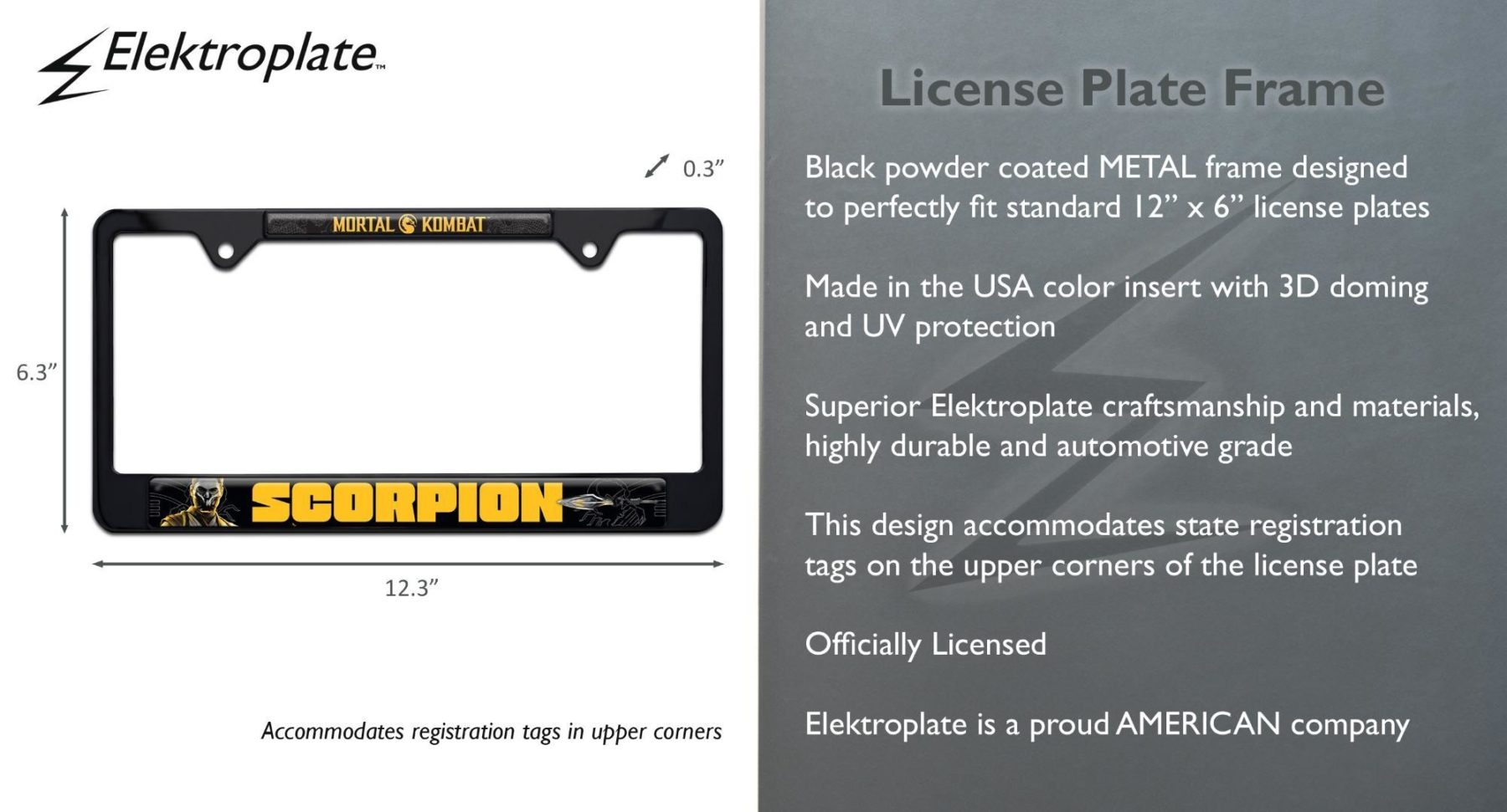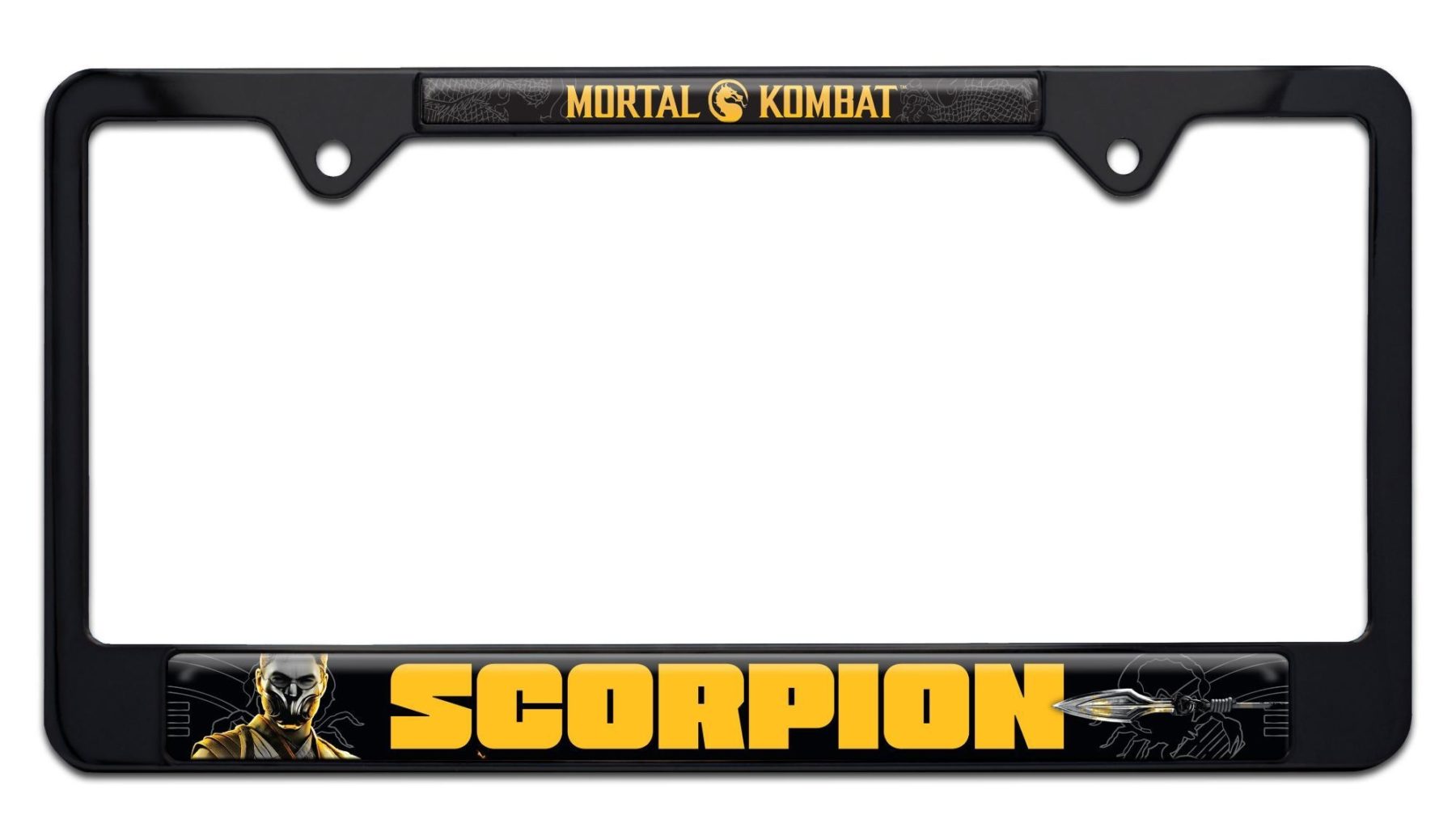Show your allegiance to one of the most iconic characters in gaming with this officially licensed Mortal Kombat Scorpion black standard license plate frame. Inspired by the legendary ninja warrior, this design is perfect for fans of classic fighting games, retro arcade culture, and the Mortal Kombat universe. Made from durable black powder coated metal, it fits standard 12 x 6 inch license plates and features a premium 3D domed insert with UV protection.
