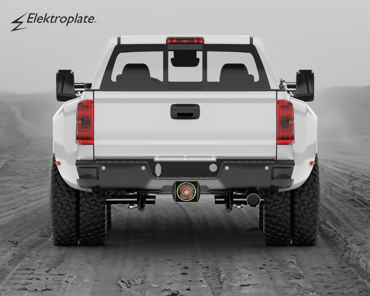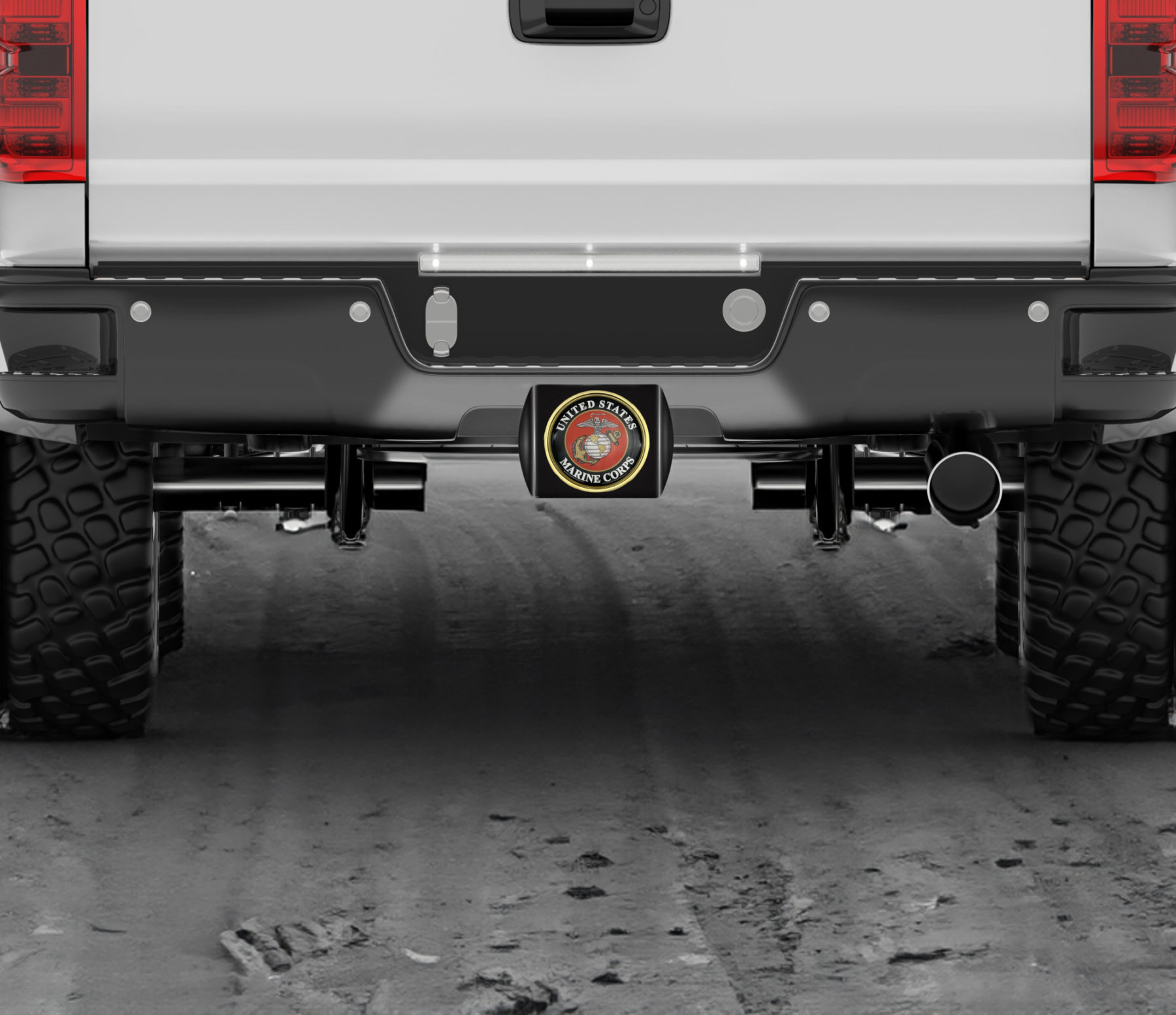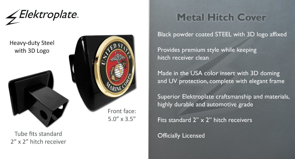 Officially Licensed – U.S. Marine Corps ALL-METAL Hitch Cover (front plate: 5” x 3.5”) by Elektroplate. A premium upgrade over cheaper plastic and pewter versions, this hitch cover features a detailed all-metal U.S. Marine emblem securely mounted on a sleek black all-metal base. Designed to fit standard 2” trailer hitch receivers and backed by a full refund guarantee if it doesn’t fit perfectly.