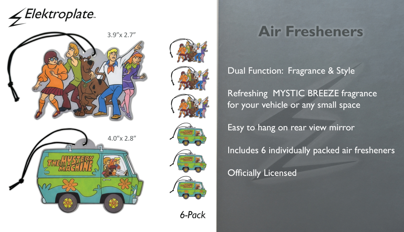 Elektroplate brings the mystery-solving fun of Scooby-Doo to your ride with a groovy line of high-quality decorative air fresheners! Cruise with the whole Mystery Inc. gang as they keep your space smelling fresh and looking awesome. Each 6-pack includes 2 designs (3 of each) Officially Licensed full-color Scooby-Doo characters (4") featuring your favorite sleuths and the refreshing Mystic Breeze scent.