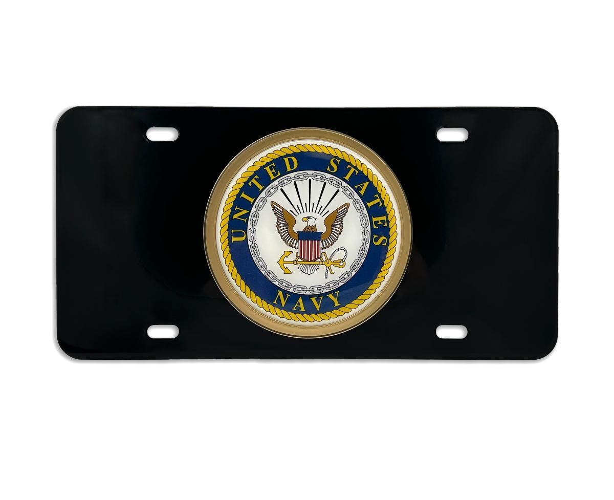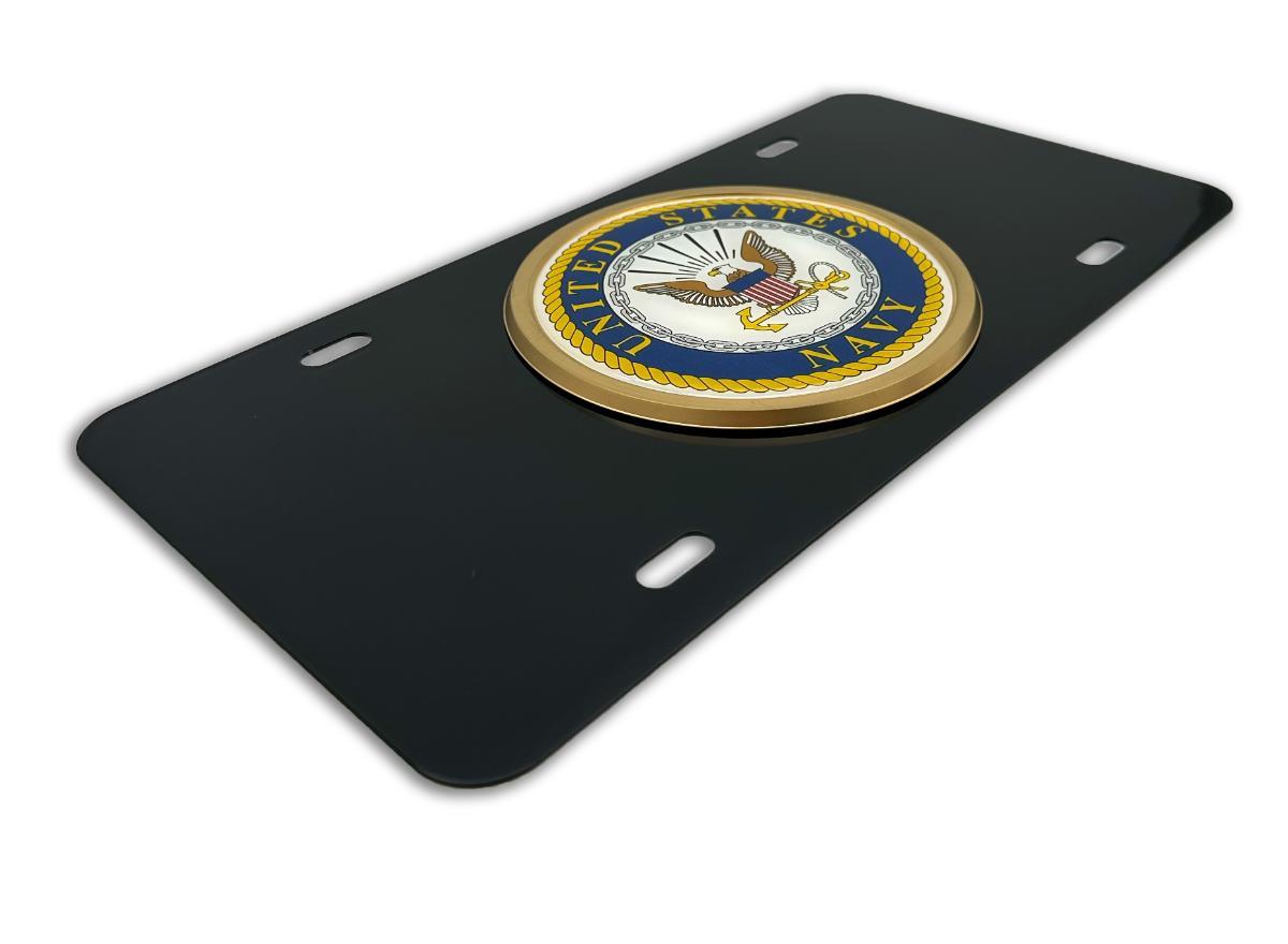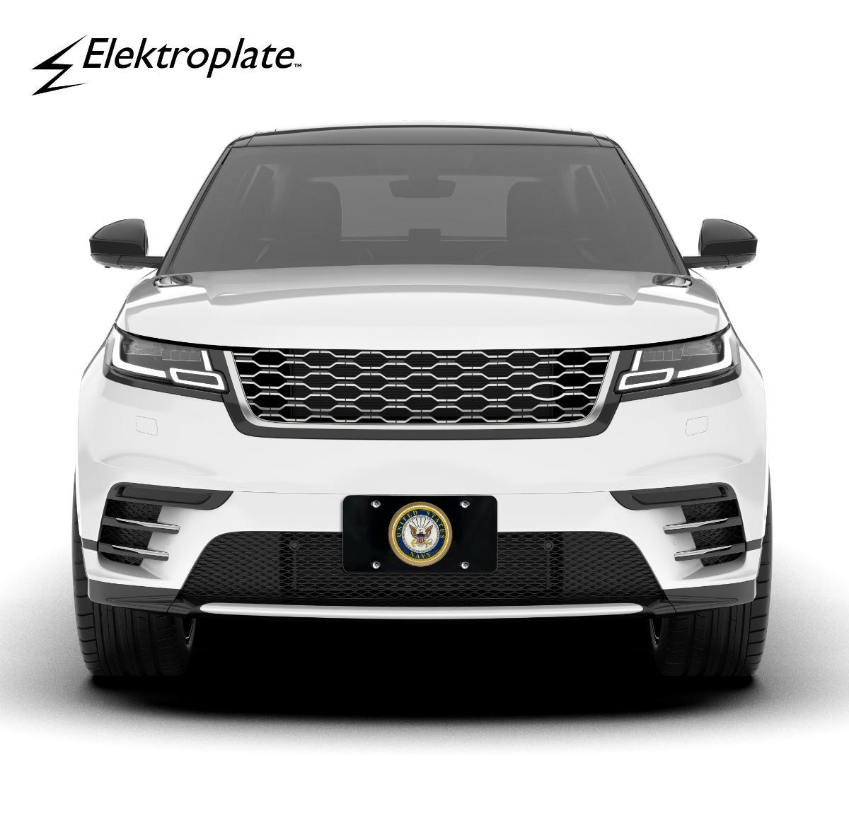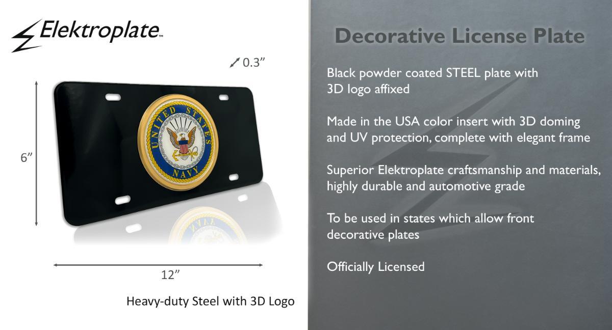 Officially licensed – United States Navy ALL METAL front license plate (12” x 6”) by Elektroplate. Comprised of an oversized UV protected decal with 3D doming features and an OEM frame adhered to a black all-metal license plate base.