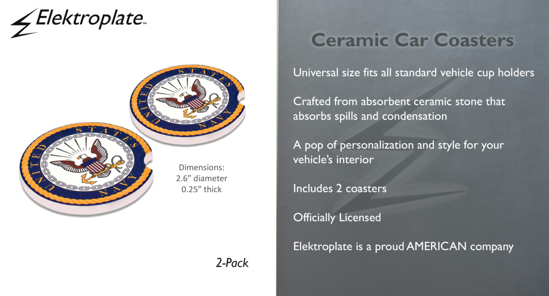 Keep your ride clean and stylish with Elektroplate's Officially Licensed U.S. Navy Car Coasters (Set of 2). These 2.6" diameter coasters are designed to fit all standard cup holders and absorb spills and condensation while maintaining their vivid colors. Crafted with care, these high-quality car coasters not only protect your car, but also add a touch of personality to your space. Easy to clean and durable enough for everyday use, they’re the ideal accessory to showcase your style on the go.