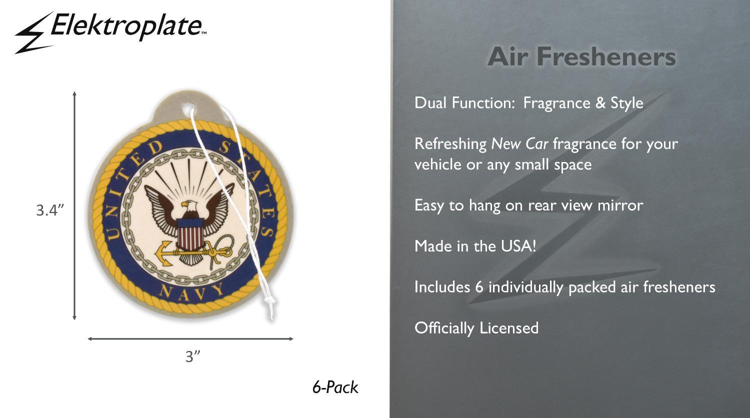 Show your Navy pride with this 6-pack of U.S. Navy air fresheners, featuring bold full-color graphics and a clean new car scent. Officially licensed and made in the USA, each air freshener measures approximately 3" x 3.3"—perfect for your car, truck, SUV, RV, boat, or locker. Ideal for military families, veterans, and active duty service members, these air fresheners are a great way to freshen up your space while honoring the U.S. Navy. Also available in a 2-pack. Great for anyone searching for Navy car accessories, military air fresheners, or patriotic gifts.