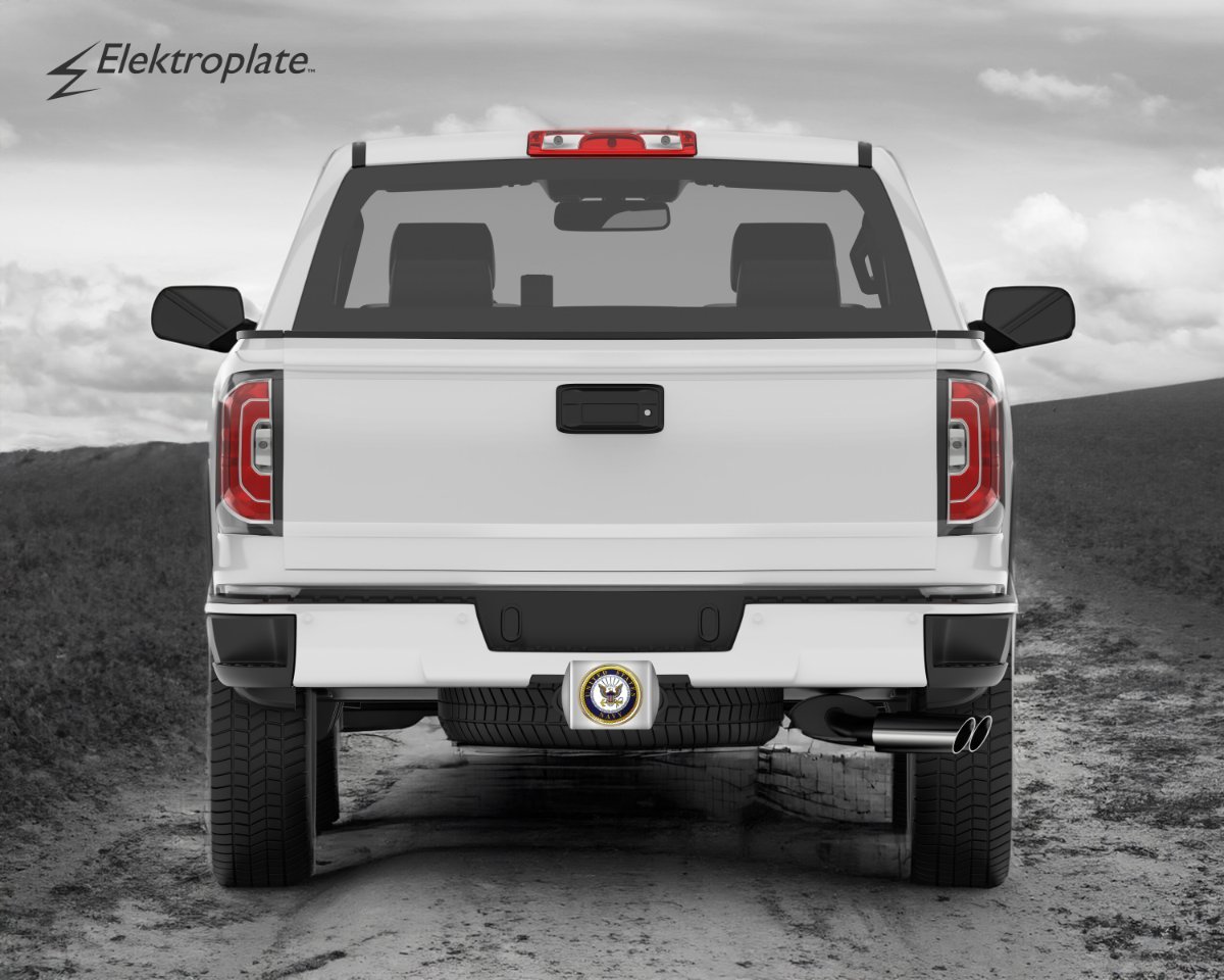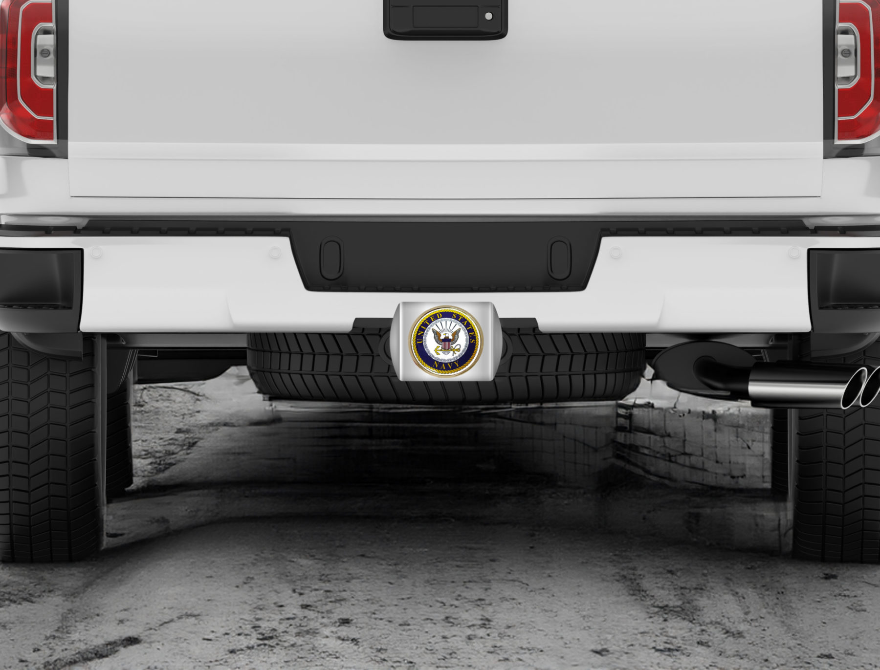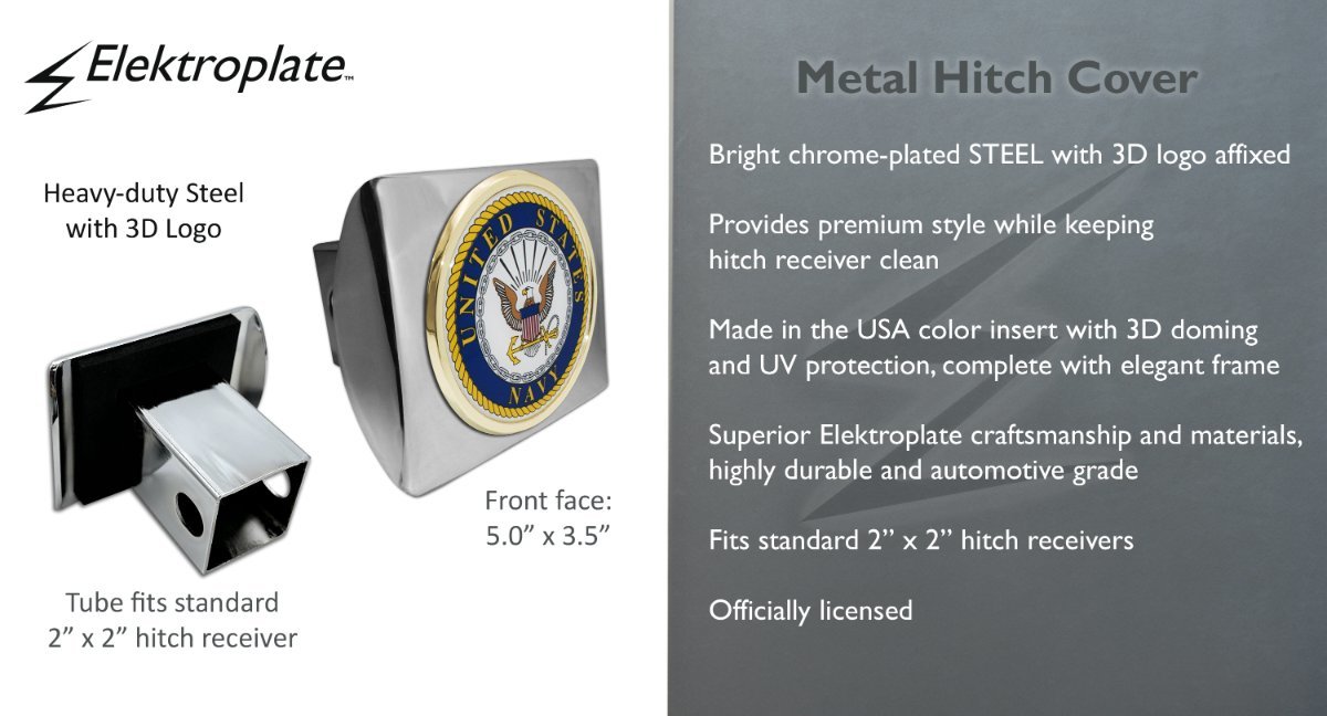 Officially Licensed – U.S. Navy ALL-METAL Hitch Cover (Front Plate: 5” x 3.5”) by Elektroplate. A premium upgrade in both quality and appearance compared to cheaper plastic or pewter alternatives. Features a bold, all-metal U.S. Navy emblem securely mounted on a polished chrome all-metal hitch cover base. Designed to fit standard 2” trailer hitch receivers—with a full refund guarantee if it doesn’t fit perfectly.