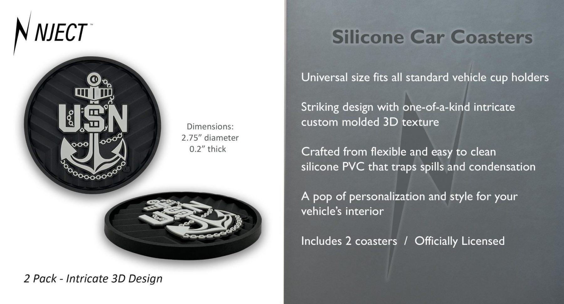 This 2-pack of silicone car coasters features the USN anchor design with intricate custom molded 3D texture and bold color contrast. The raised detailing adds depth, durability, and visual impact while providing a pop of personality and style to your vehicle’s interior. Designed for everyday use, these silicone cup holder coasters combine functional protection with patriotic flair in a durable automotive accessory.