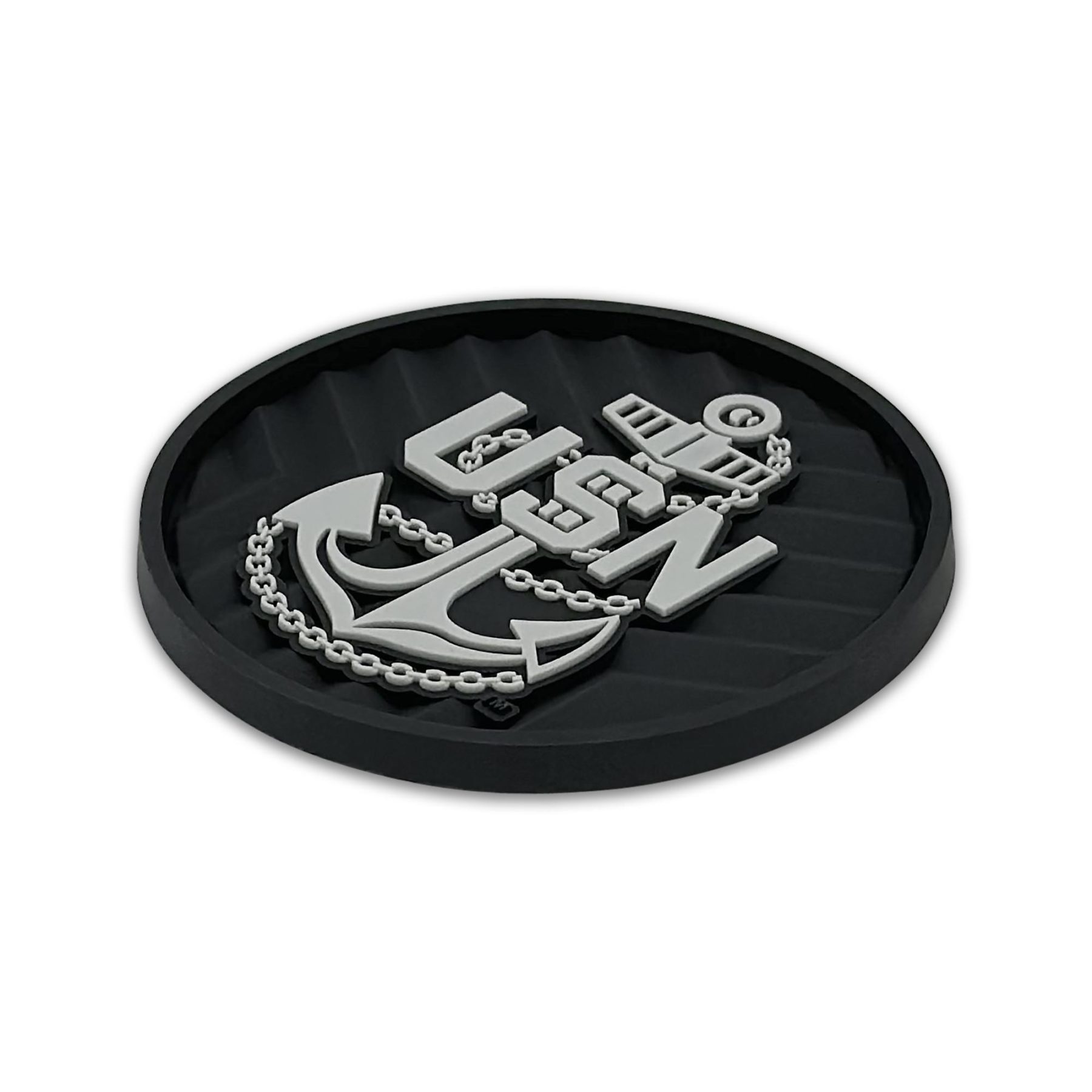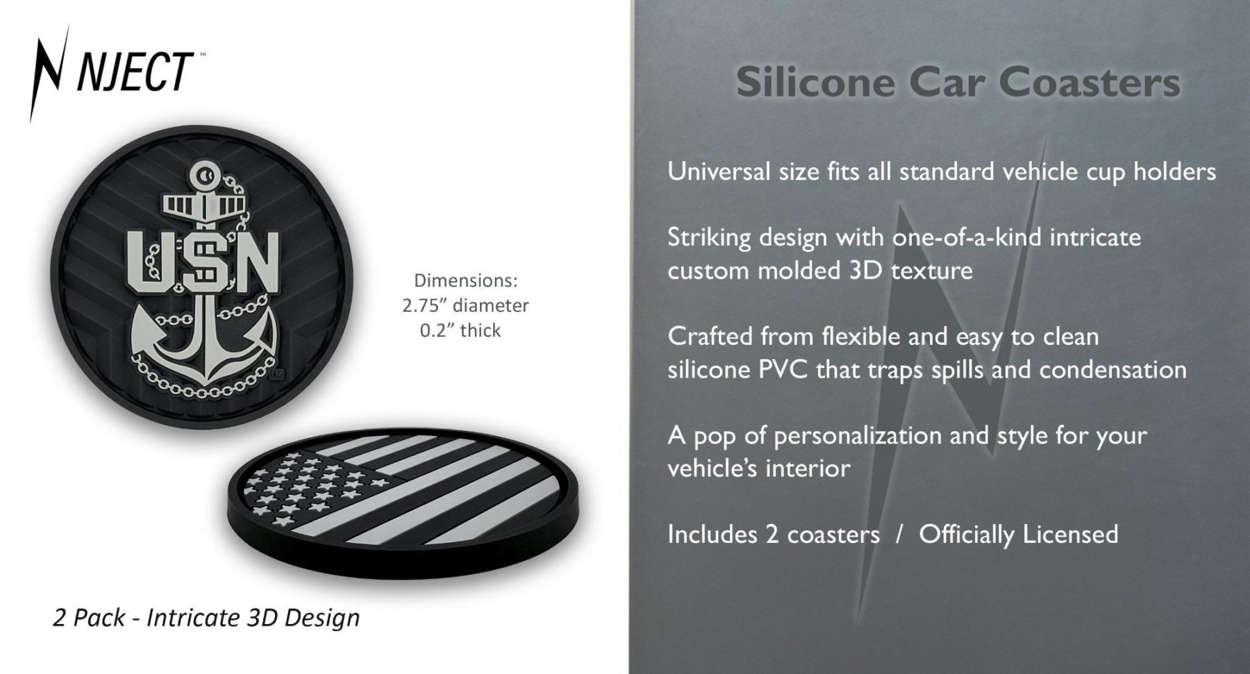 This 2-pack of silicone car coasters features the inverted American flag and USN anchor design with intricate custom molded 3D texture and bold color contrast. The raised detailing adds depth, durability, and visual impact while providing a pop of personality and style to your vehicle’s interior. Designed for everyday use, these silicone cup holder coasters combine functional protection with patriotic flair in a durable automotive accessory.