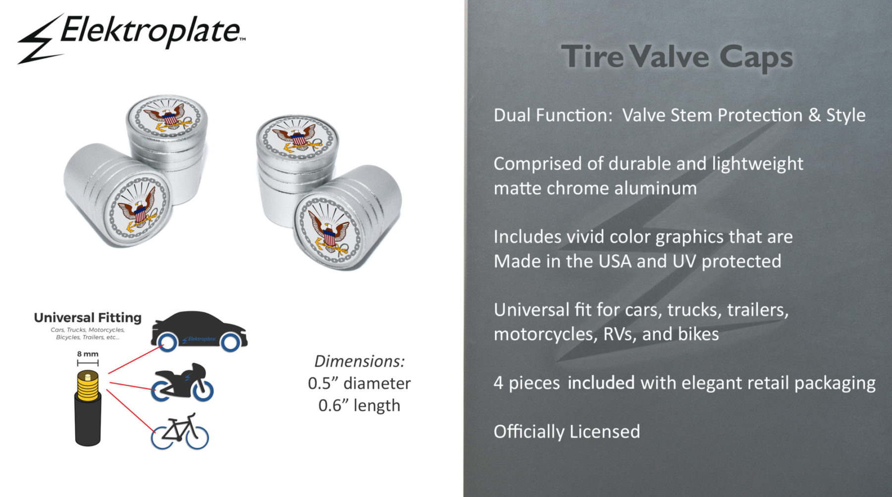 Officially Licensed – U.S. Navy 4-Piece Matte Chrome Universal Valve Stem Caps by Elektroplate.