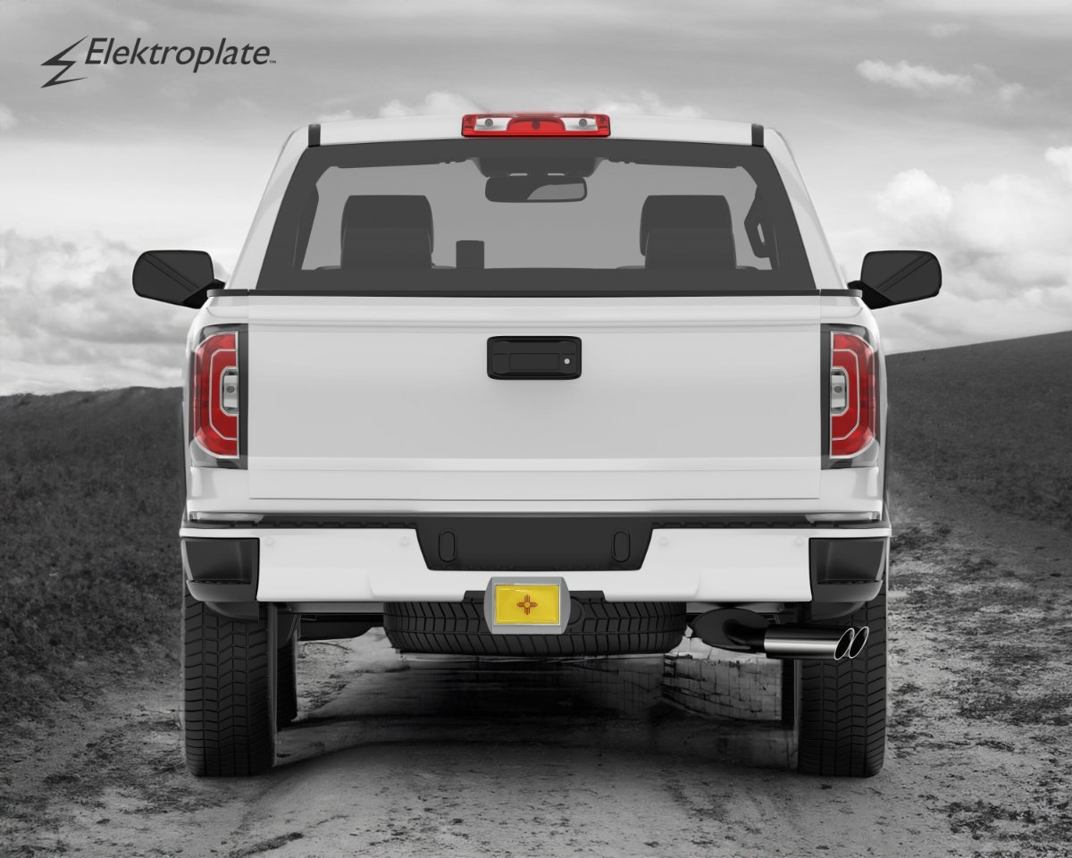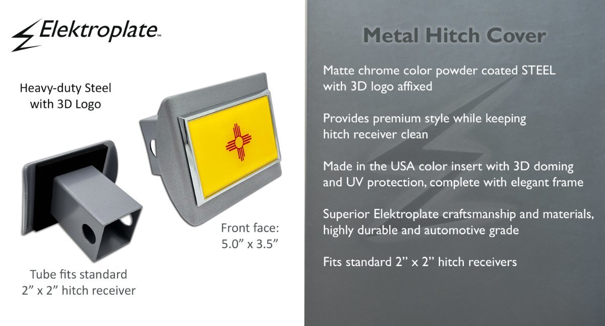 New Mexico Flag ALL-METAL Hitch Cover (Front plate measures 5” x 3.5”) by Elektroplate – a premium upgrade in both quality and design over cheaper plastic or pewter versions. Featuring an OEM New Mexico Flag emblem (ABS plastic core with a chrome-plated metal finish) mounted on a sleek brushed chrome all-metal hitch cover. Designed to fit all standard 2” trailer hitch receivers. If it doesn’t fit perfectly, return it for a full refund.