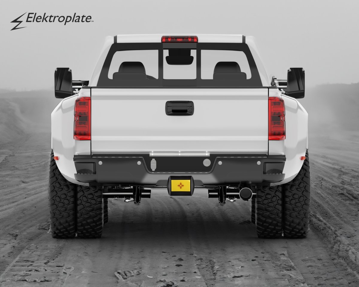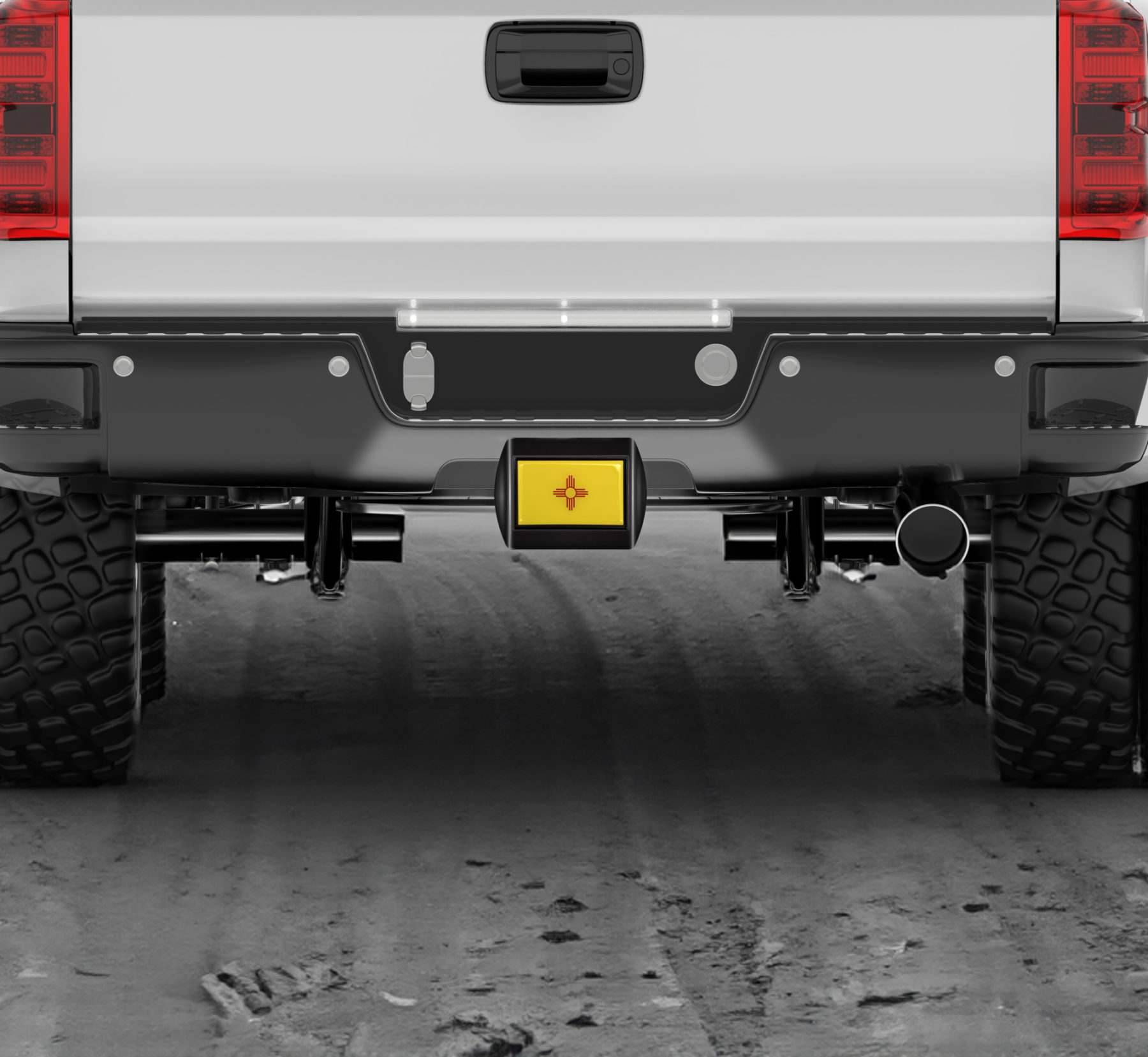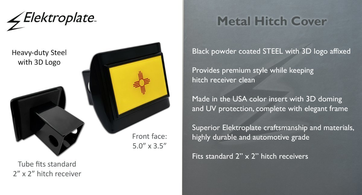New Mexico State Flag ALL-METAL Hitch Cover (Front plate measures 5” x 3.5”) by Elektroplate – a superior upgrade in both quality and appearance compared to cheaper plastic or pewter alternatives. The hitch cover features a premium OEM New Mexico emblem (ABS plastic core with a chrome-plated metal finish) securely affixed to a sleek, black all-metal hitch cover mount. Designed to fit all standard 2” trailer hitch receivers. If it doesn’t fit perfectly, simply return it for a full refund.