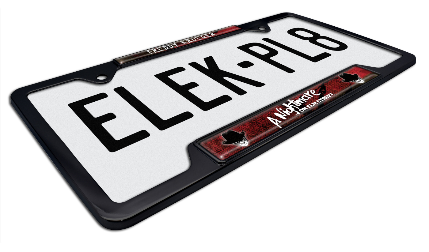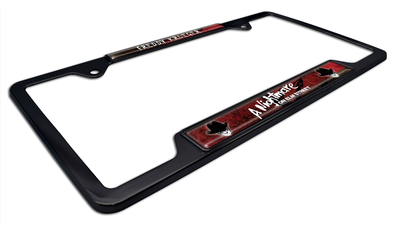 Elevate your vehicle’s style with this eerie Freddy Krueger Officially Licensed Nightmare on Elm Street black powder coated metal license plate frame (12.3" x 6.3") by Elektroplate. This high-quality all-metal frame is built to endure the elements, ensuring it remains looking brand new for years without chipping or fading. The frame features Made in the USA graphic inserts with 3D doming, vivid colors, and UV protection.