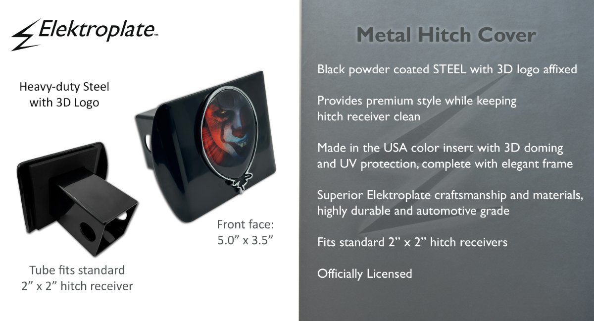 Measuring 5.0” x 3.5”, this hitch cover is built to fit all standard 2-inch (5 cm) trailer hitch receivers—perfect for cars, trucks, or SUVs. Whether you’re towing or just adding a twisted touch to your vehicle, Pennywise will turn heads and strike fear wherever you roam.