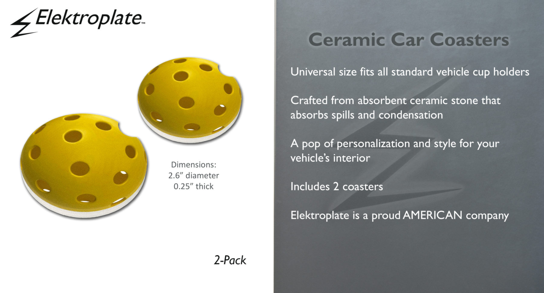 Keep your ride clean and stylish with Elektroplate's Pickleball Car Coasters (Set of 2). These 2.6" diameter coasters are designed to fit all standard cup holders and absorb spills and condensation while maintaining their vivid colors. Crafted with care, these high-quality car coasters not only protect your car, but also add a touch of personality to your space. Easy to clean and durable enough for everyday use, they’re the ideal accessory to showcase your style on the go.