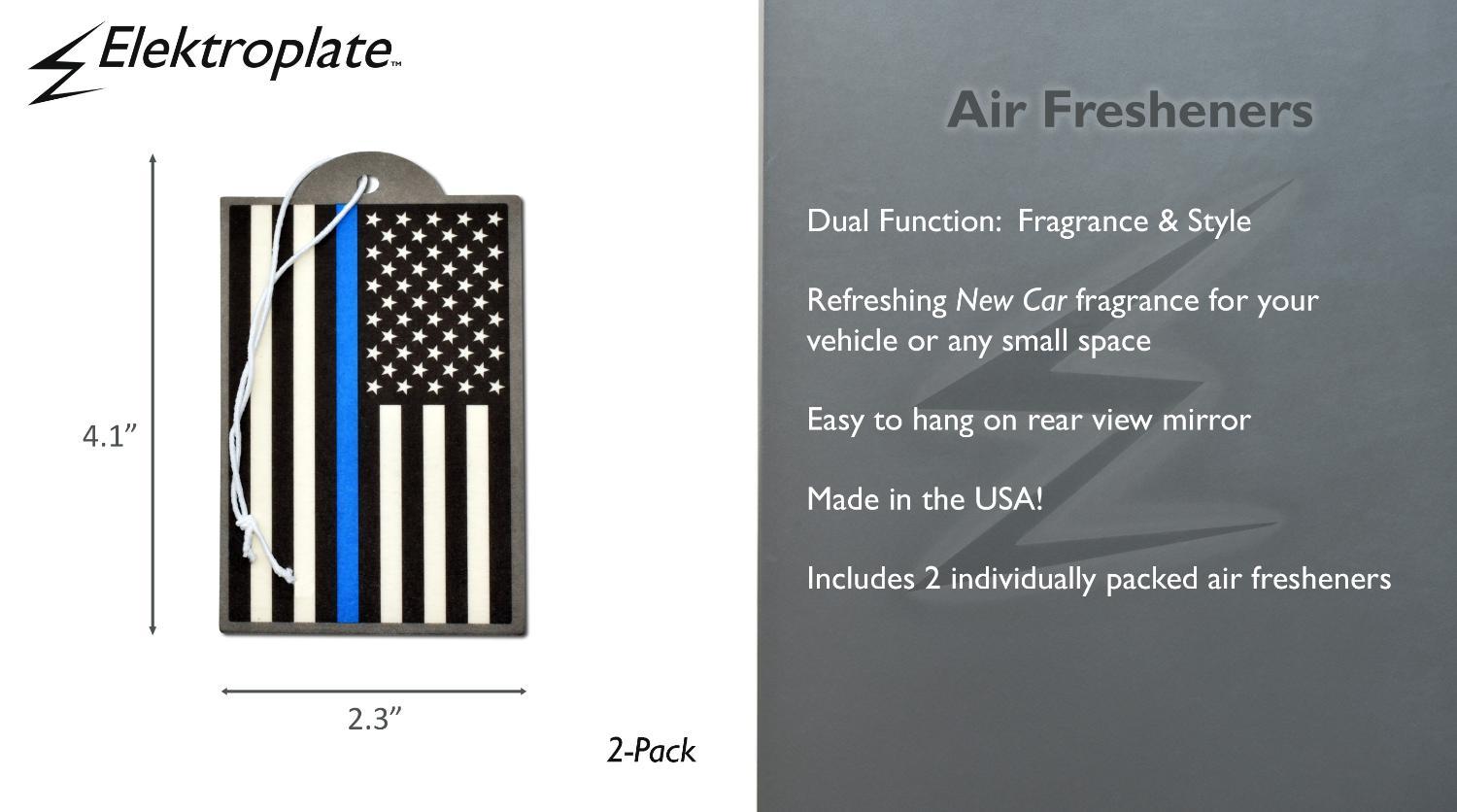 Back the blue with this 2-pack of Police air fresheners, featuring vibrant full-color law enforcement shield designs and a refreshing new car scent. Made in the USA and measuring approximately 2.3" x 4", these patriotic air fresheners are great for cars, trucks, lockers, or offices. A thoughtful gift for police officers, law enforcement families, or supporters of the thin blue line. Also available in a 6-pack. Perfect for anyone searching for police officer gifts, cop car accessories, or law enforcement décor.