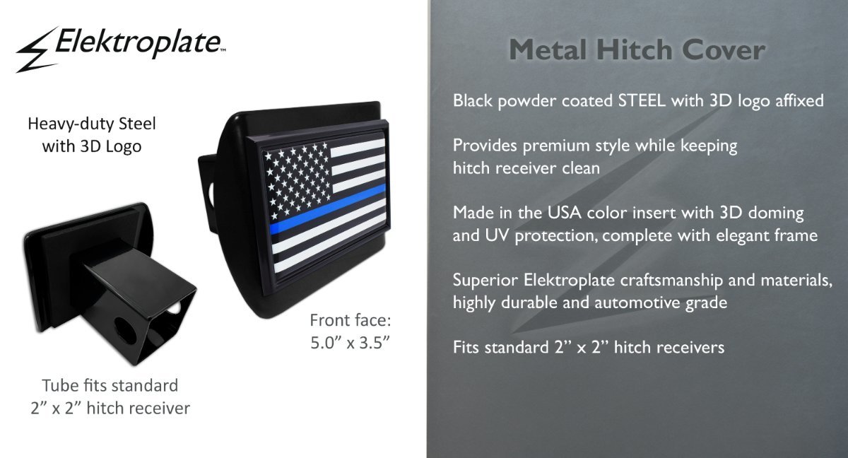 Police USA Flag ALL-METAL hitch cover (front plate is 5” x 3.5”) by Elektroplate — a step above in quality and appearance compared to cheaper plastic and pewter versions. Features a Police emblem with an OEM ABS plastic core and chrome-plated metal finish, securely mounted on a black all-metal hitch cover. Fits standard 2” trailer hitch receivers (if it doesn’t fit perfectly, you may return it for a full refund).