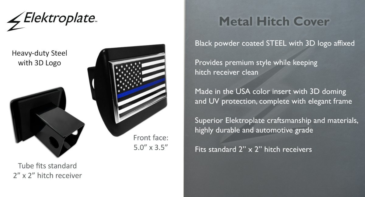 Police USA Flag ALL-METAL hitch cover (front plate is 5” x 3.5”) by Elektroplate — a step above in quality and appearance compared to cheaper plastic and pewter versions. Features a Police emblem with an OEM ABS plastic core and chrome-plated metal finish, securely mounted on a black all-metal hitch cover. Fits standard 2” trailer hitch receivers (if it doesn’t fit perfectly, you may return it for a full refund).