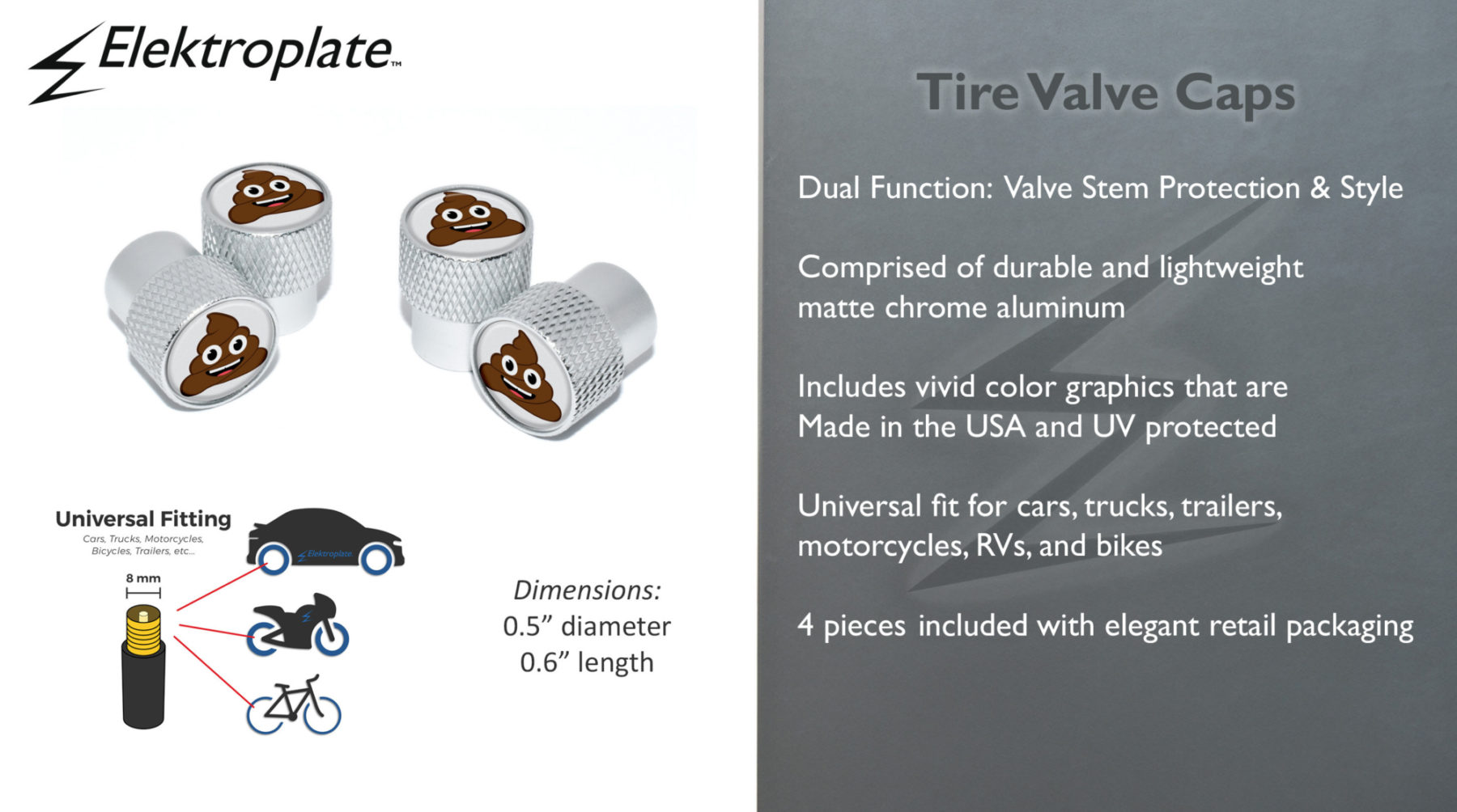 Poop Emoji 4-Piece Matte Chrome Universal Valve Stem Caps by Elektroplate. Crafted with UV-protected, scratch-resistant domed graphics made in the USA, these premium valve caps pair durability with a playful poop emoji design and sleek matte chrome finish. Each cap is made from lightweight, corrosion-resistant aluminum and includes a high-quality leakproof sealing ring to help prevent pressure loss.