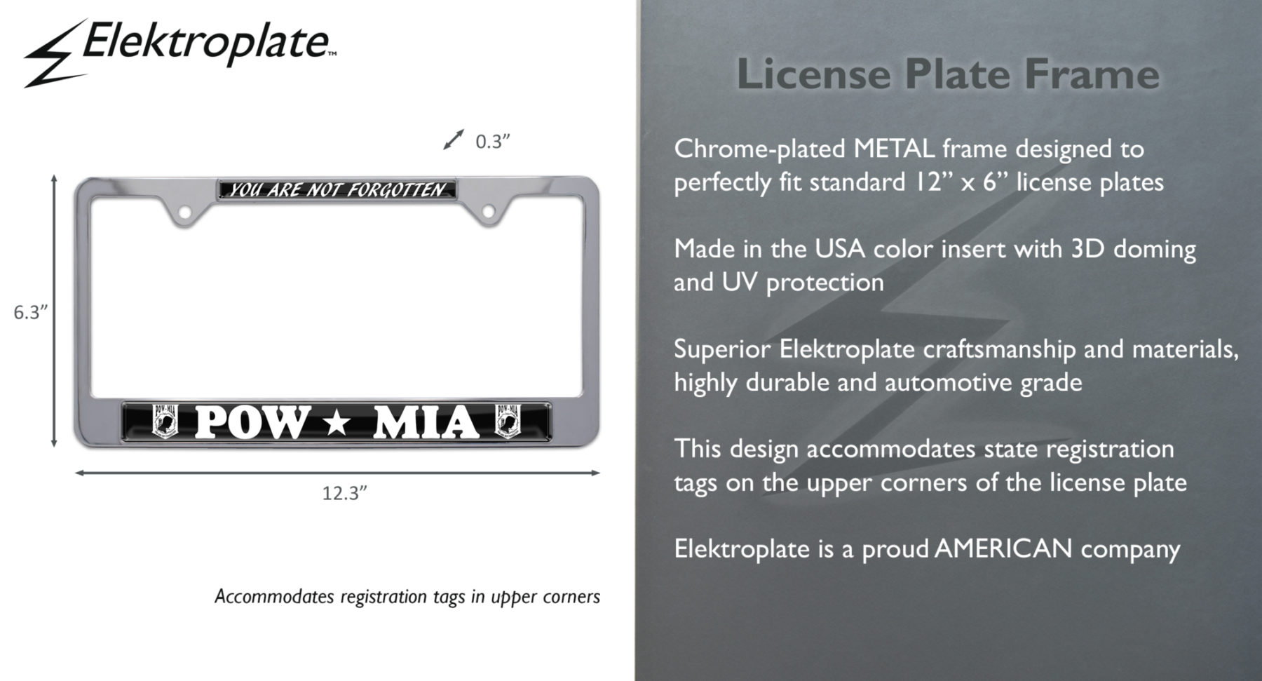 Officially licensed – POW/MIA shiny chrome license plate frame (12.3" x 6.3") by Elektroplate. All-metal (NOT plastic) frame with a shiny chrome finish, and full color UV-protected domed inserts.