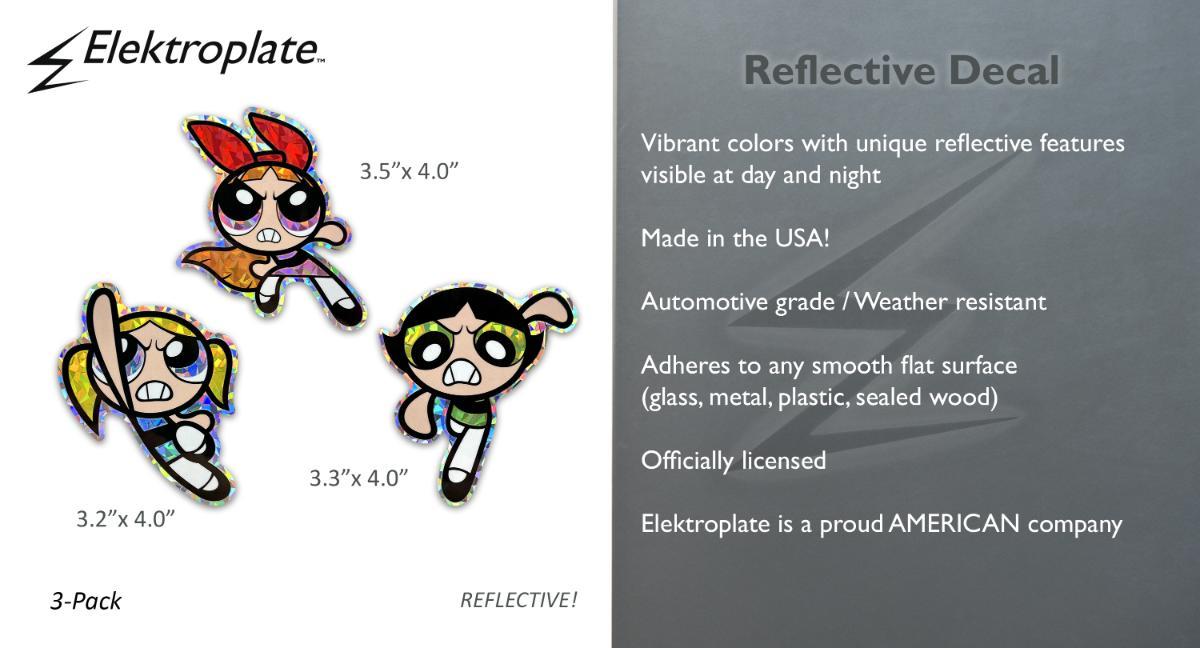 Bring the full Powerpuff Girls squad to your favorite surfaces with this vibrant Powerpuff Girls Reflective Decal 3-Pack. This set includes Blossom, Bubbles, and Buttercup in dynamic action poses, each featuring bold colors and faceted reflective details that shine in both daylight and low-light conditions. It’s the perfect way to show off nostalgic style with a fun, high-energy look.