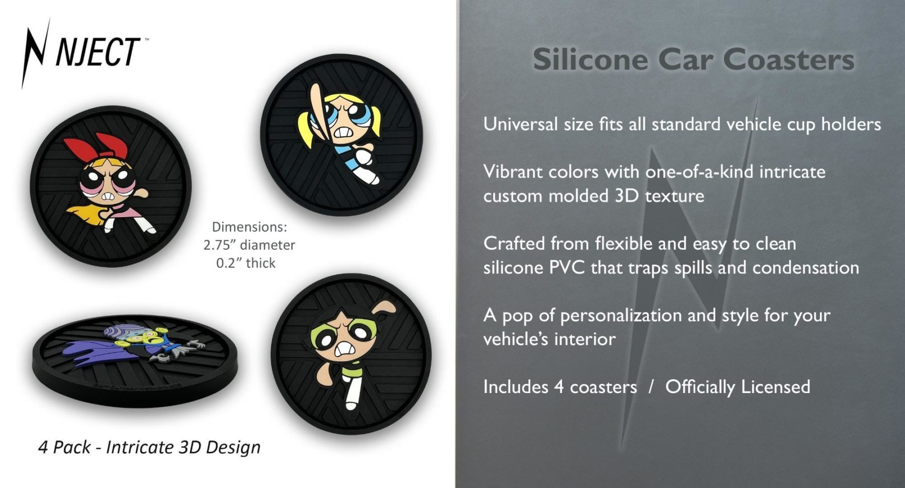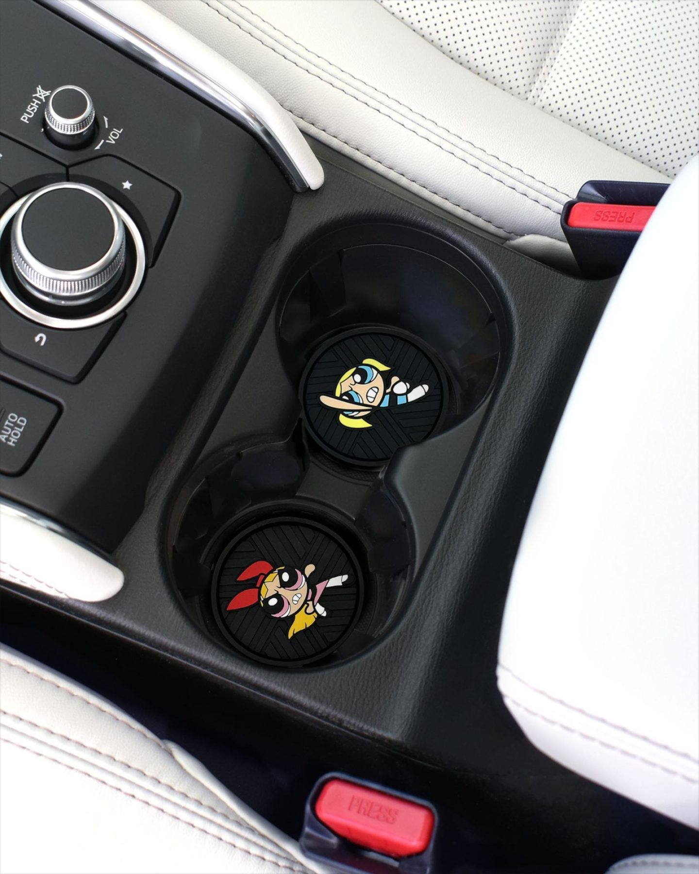This 4-pack of silicone car coasters features Buttercup, Bubbles, Blossom and Mojo Jojo designs with intricate custom molded 3D texture and bold color contrast. The raised detailing adds depth, durability, and visual impact while providing a pop of personality and style to your vehicle’s interior. Designed for everyday use, these silicone cup holder coasters combine functional protection with iconic Powerpuff Girls flair in a durable automotive accessory.