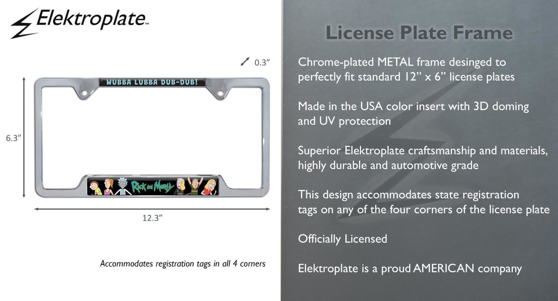 The open design provides a streamlined look while keeping registration tags visible on the upper corners. Built from premium automotive grade materials, this frame is made to withstand everyday use while maintaining its polished appearance. A great addition for fans of Rick and Morty, this frame delivers both style and functionality.