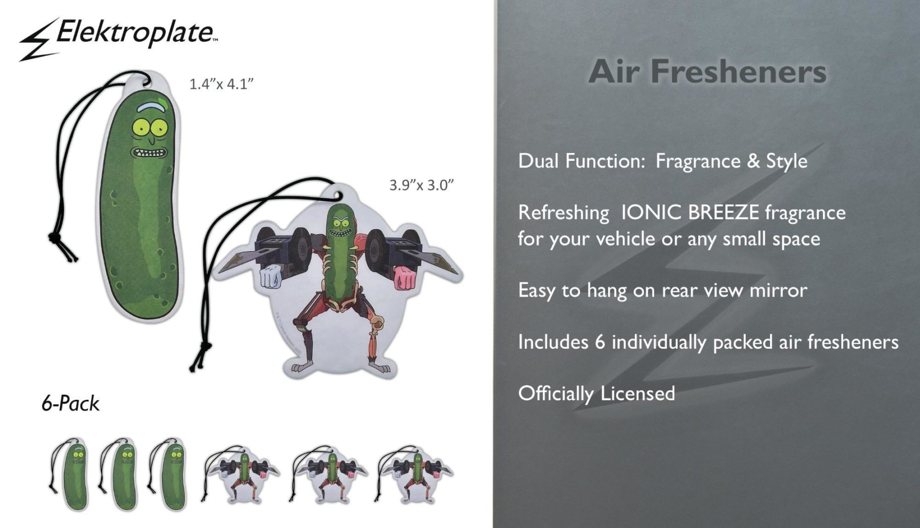 Bring a fresh burst of fragrance and fandom to your ride with the Elektroplate Rick and Morty Pickle air freshener 6-pack in Ionic Breeze. Featuring fan-favorite Pickle Rick designs, this officially licensed air freshener set combines bold style with everyday function, making it the perfect accessory for your car, truck, or SUV. The Ionic Breeze scent delivers a smooth, refreshing blend of musk, sandalwood, and amber, helping eliminate odors while creating a clean, modern atmosphere. Designed to hang easily from your rearview mirror, these air fresheners add personality and a subtle statement to any space.