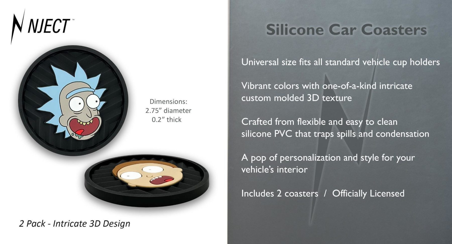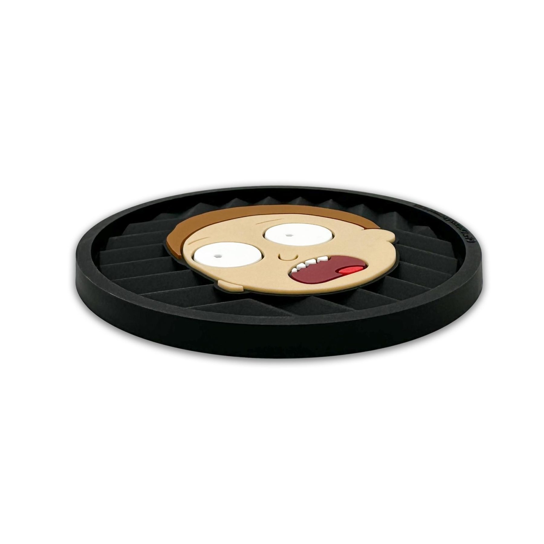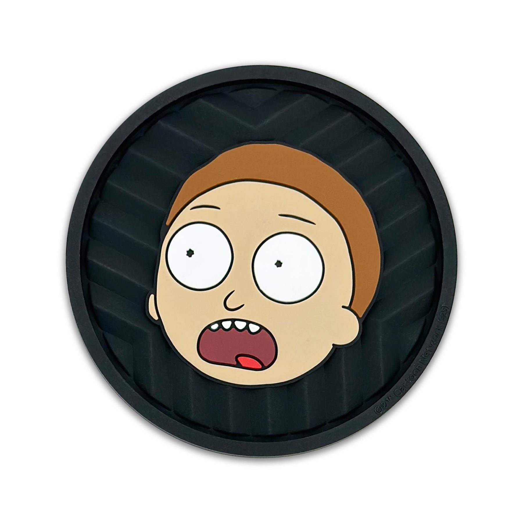 This 2-pack of silicone car coasters features a goofy Rick & Morty design with intricate custom molded 3D texture and bold color contrast. The raised detailing adds depth, durability, and visual impact while providing a pop of personality and style to your vehicle’s interior. Designed for everyday use, these silicone cup holder coasters combine functional protection with style in a durable automotive accessory.