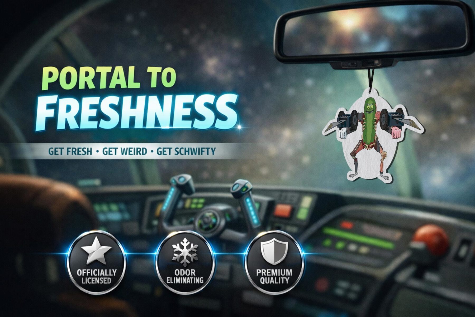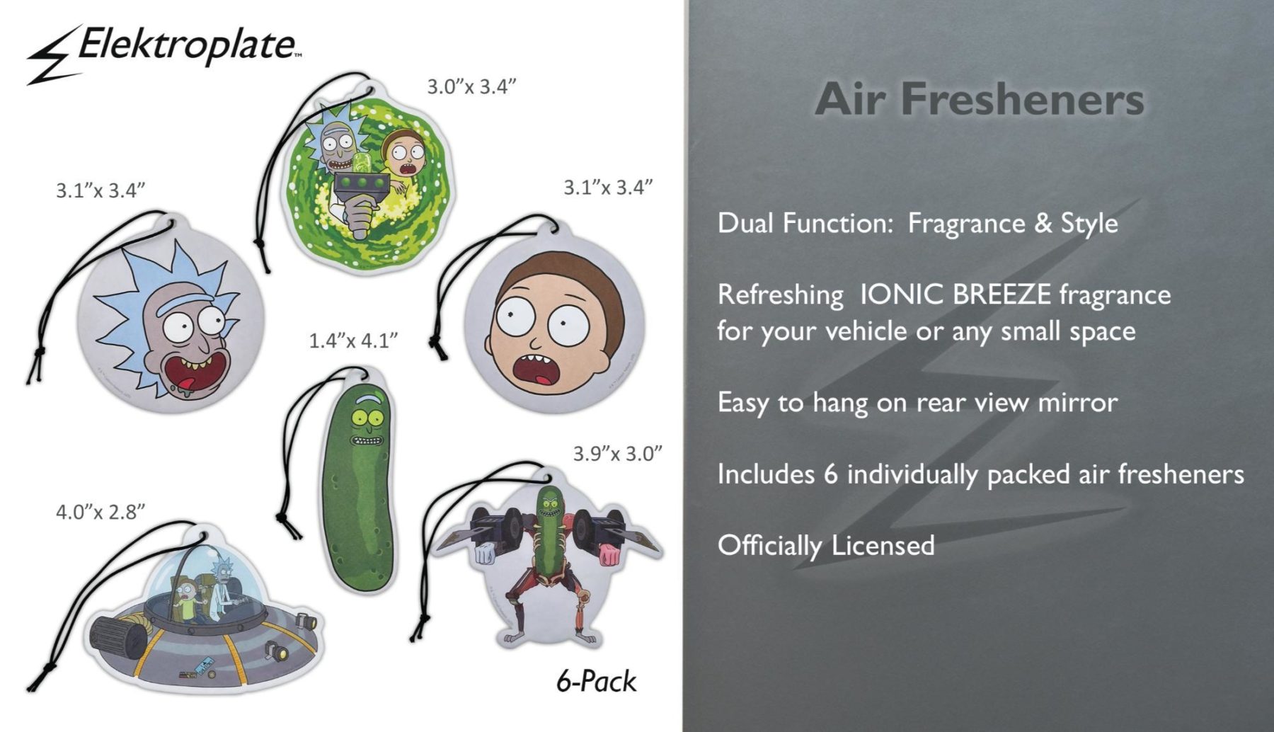 Get the best of every dimension with the Elektroplate Rick & Morty Variety Air Freshener 6-Pack in Ionic Breeze. This officially licensed set features a mix of fan-favorite designs including Rick, Morty, Pickle Rick, the spaceship, and portal artwork, delivering both style and function for your car or small space. The Ionic Breeze scent blends musk, sandalwood, and amber for a refreshing, long-lasting fragrance that helps eliminate odors while creating a clean, modern feel. Each air freshener easily hangs from your rearview mirror, adding personality to every drive.