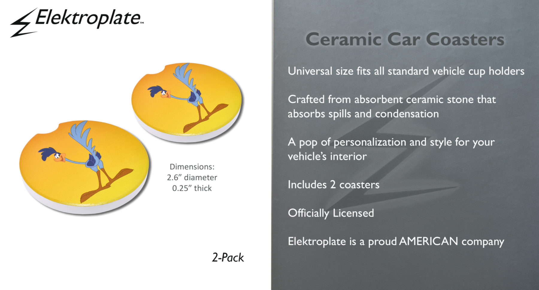 Keep your ride clean and stylish with Elektroplate's Officially Licensed Looney Tunes Road Runner Car Coasters (Set of 2). These 2.6" diameter coasters are designed to fit all standard cup holders and absorb spills and condensation while maintaining their vivid colors. Crafted with care, these high-quality car coasters not only protect your car, but also add a touch of personality to your space. Easy to clean and durable enough for everyday use, they’re the ideal accessory to showcase your style on the go.