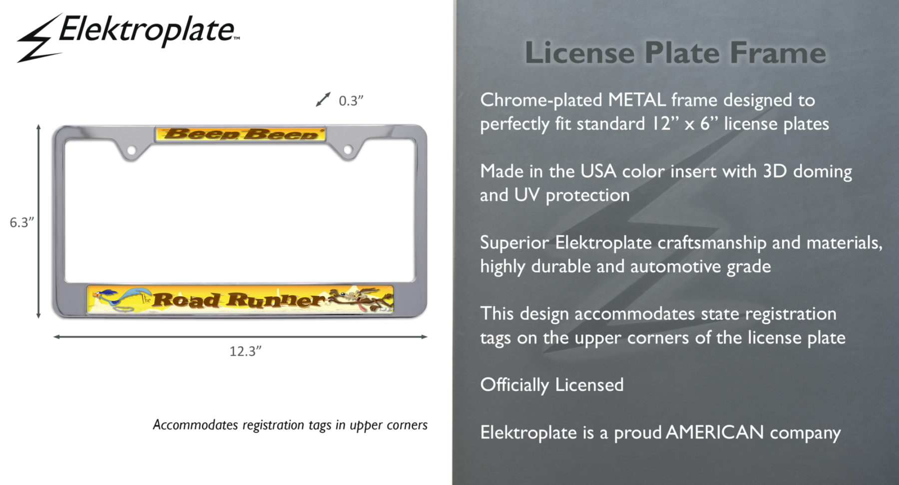 Elevate your vehicle’s style with this Officially Licensed Looney Tunes Road Runner "Beep Beep" chrome-plated metal license plate frame (12.3" x 6.3") by Elektroplate. This high-quality all-metal frame is built to endure the elements, ensuring it remains looking brand new for years without chipping or fading. The frame features Made in the USA graphic inserts with 3D doming, vivid colors, and UV protection.