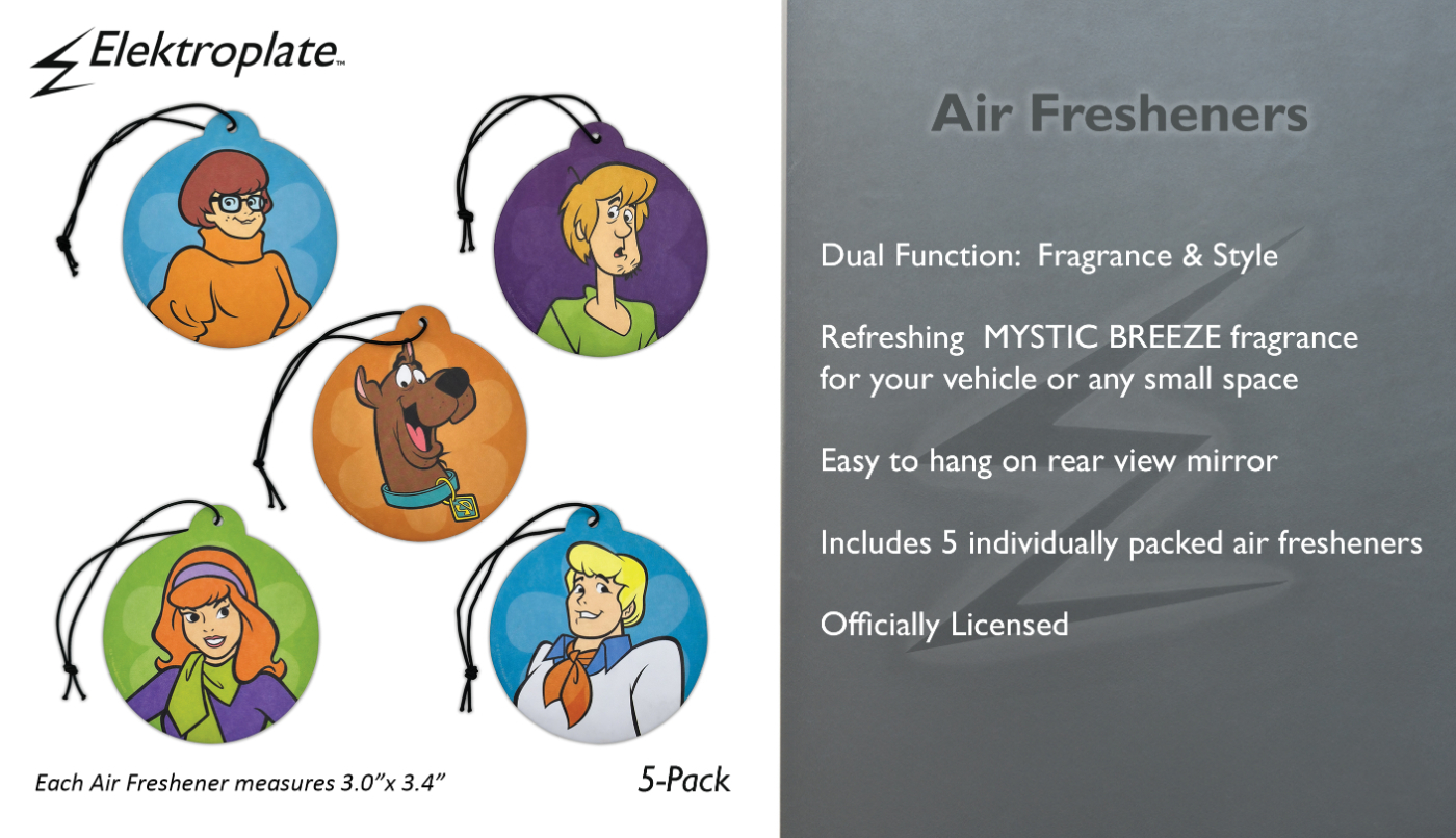 Elektroplate brings the mystery-solving fun of Scooby-Doo to your ride with a groovy line of high-quality decorative air fresheners! Cruise with the whole Mystery Inc. gang as they keep your space smelling fresh and looking awesome. Each pack includes 5 Officially Licensed vibrant color Scooby-Doo characters (3.4” x 3.0”) featuring your favorite sleuths and the refreshing Mystic Breeze scent.