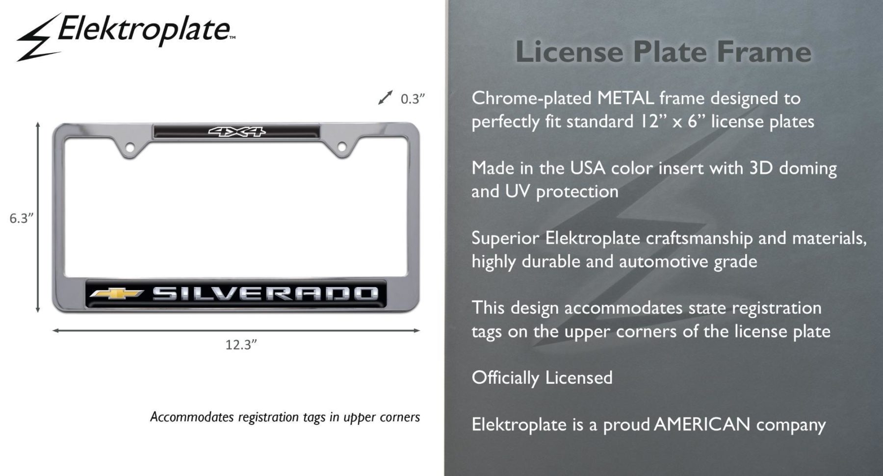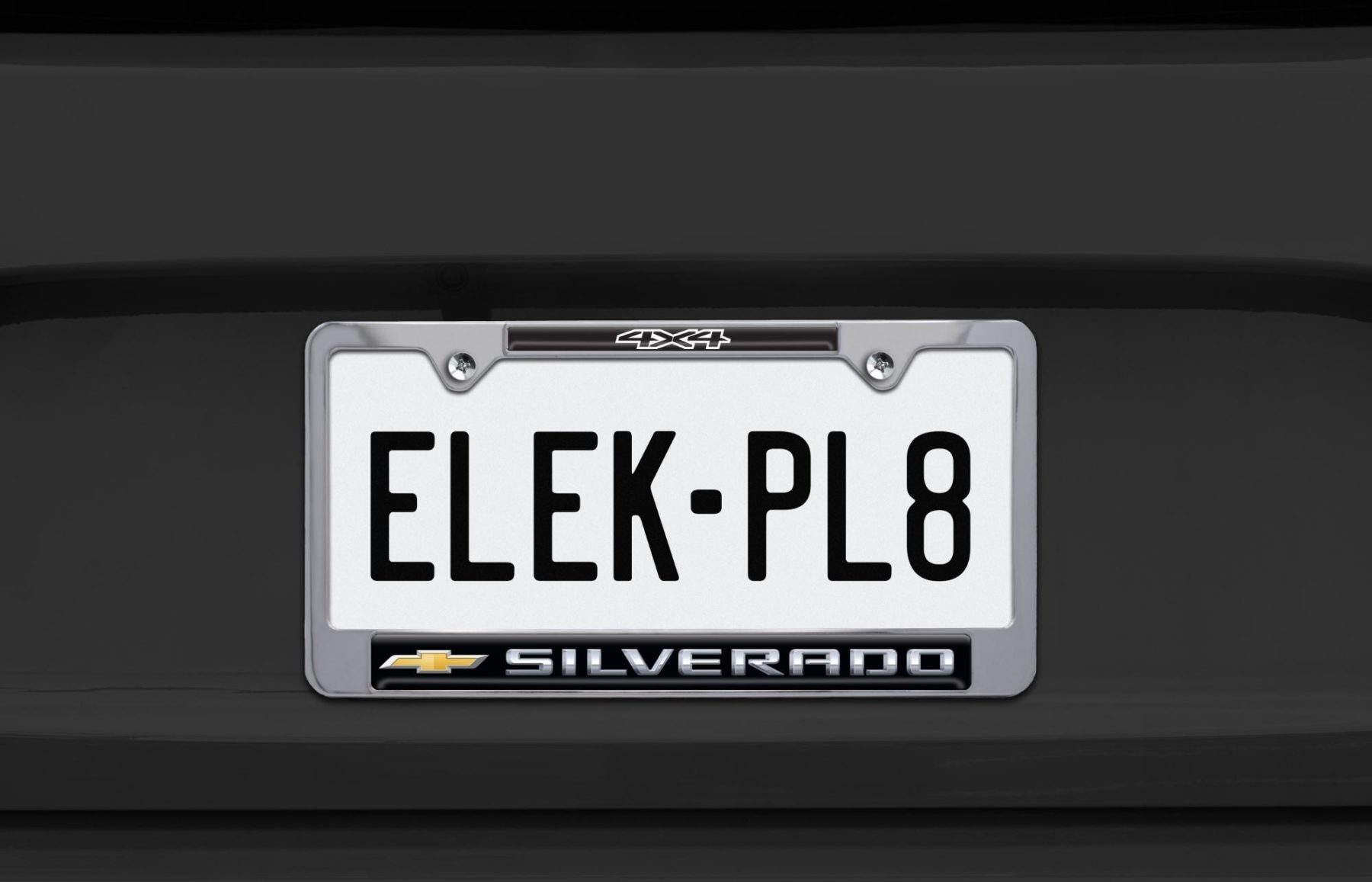 Upgrade your truck with this officially licensed Silverado 4x4 license plate frame from Elektroplate, designed for drivers who want to highlight both performance and off-road capability. Made from high-quality metal with black powder coated or chrome plated finishes, this frame fits standard 12 x 6 inch plates. The USA-made 3D domed insert includes UV protection to resist fading and maintain a bold, rugged appearance over time.