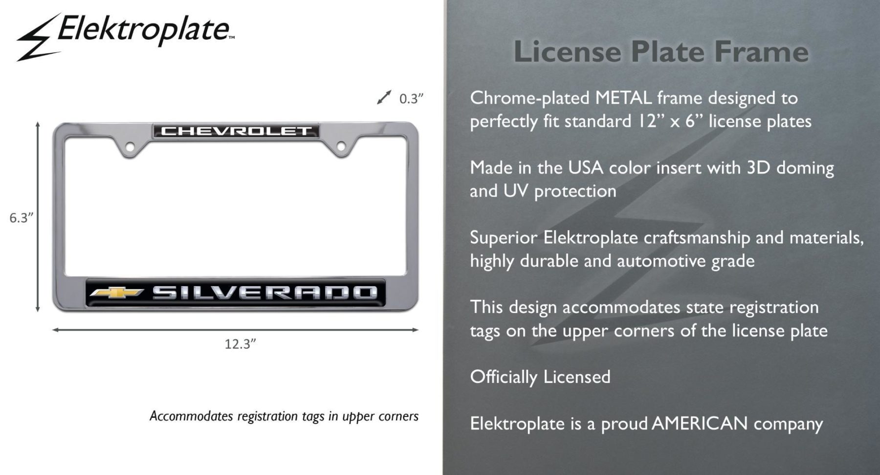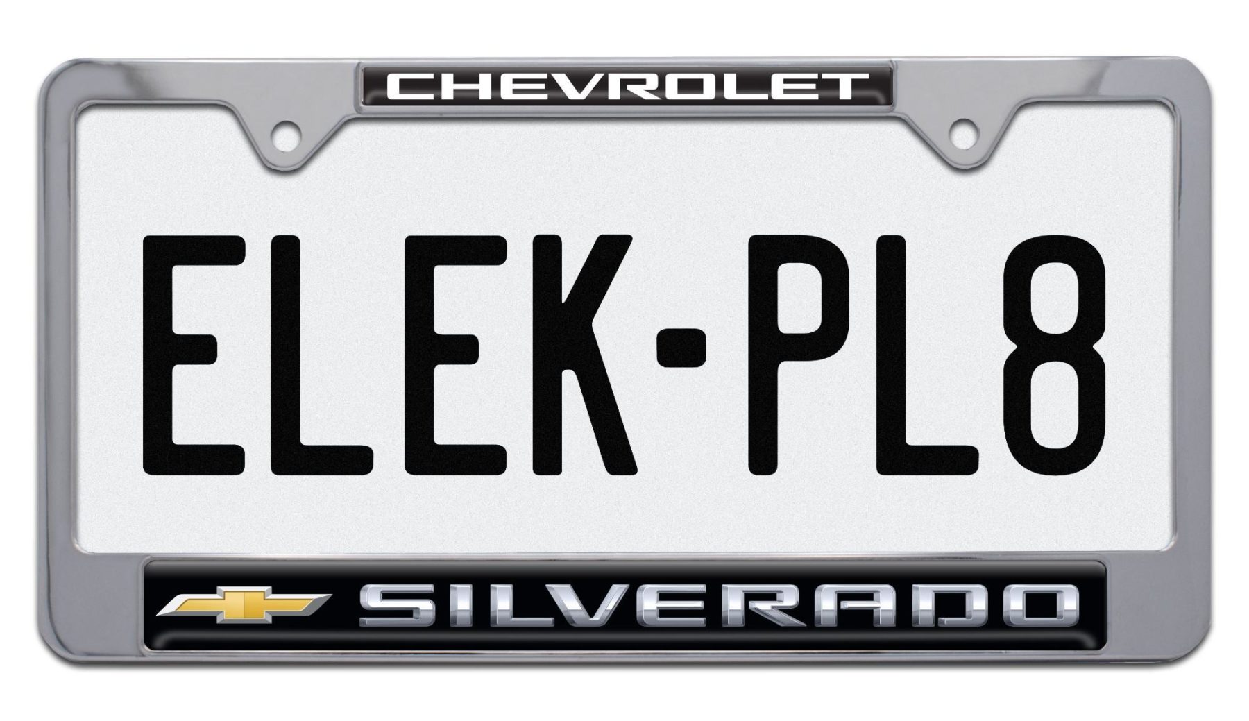 Enhance your truck’s look with this officially licensed Silverado Chevy license plate frame from Elektroplate, combining bold branding with premium construction. Designed to fit standard 12 x 6 inch plates, this metal frame is available in black powder coated or chrome plated finishes. The 3D domed insert is made in the USA and protected against UV damage, ensuring long-lasting color and clarity.