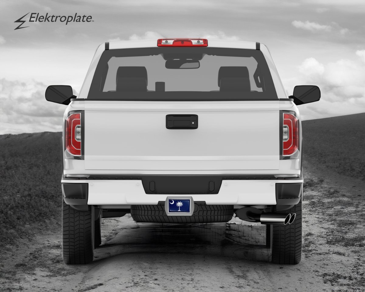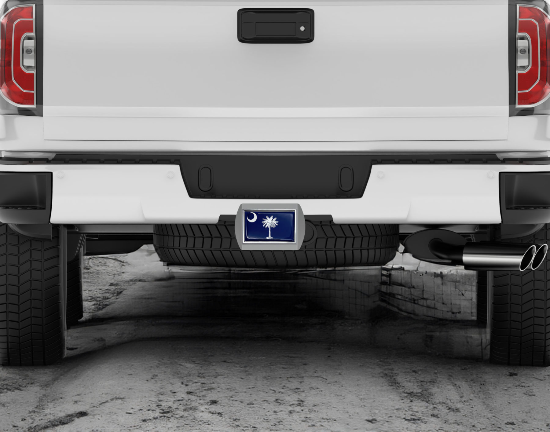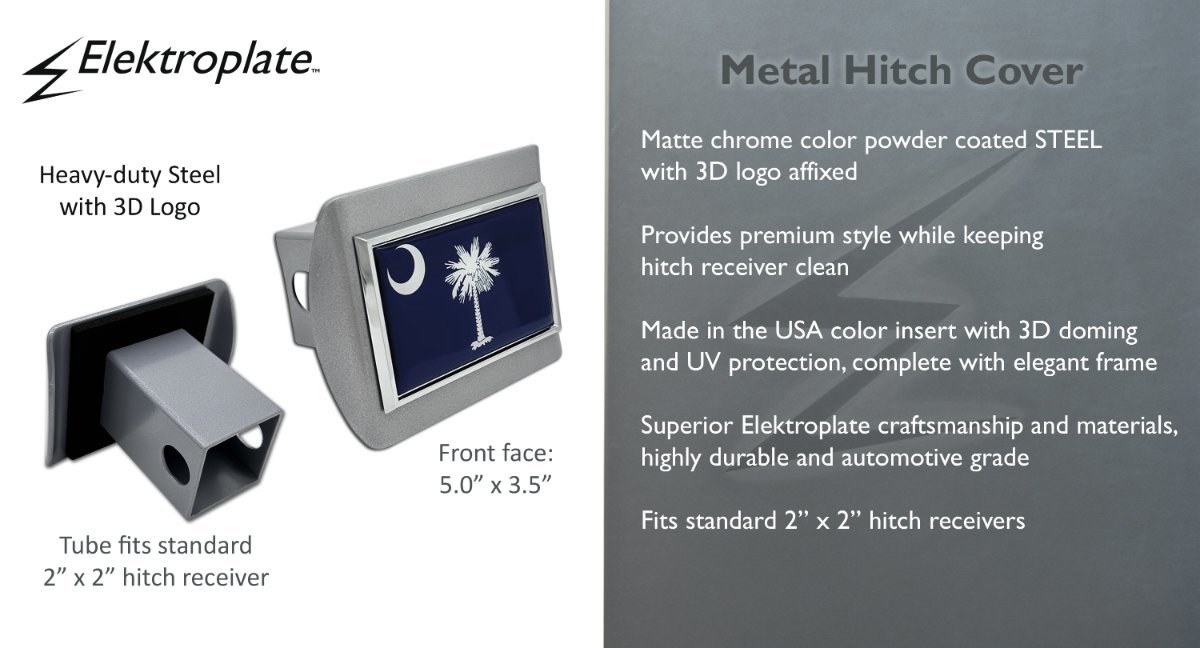 South Carolina Flag ALL-METAL hitch cover (front plate measures 5” x 3.5”) by Elektroplate offers superior quality and appearance compared to cheaper plastic and pewter versions. It features an OEM ABS plastic core with a chrome-plated metal finish South Carolina Flag emblem securely adhered to a brushed chrome all-metal hitch cover mount. Designed to fit standard 2” trailer hitch receivers—if it doesn’t fit perfectly, you may return it for a full refund.