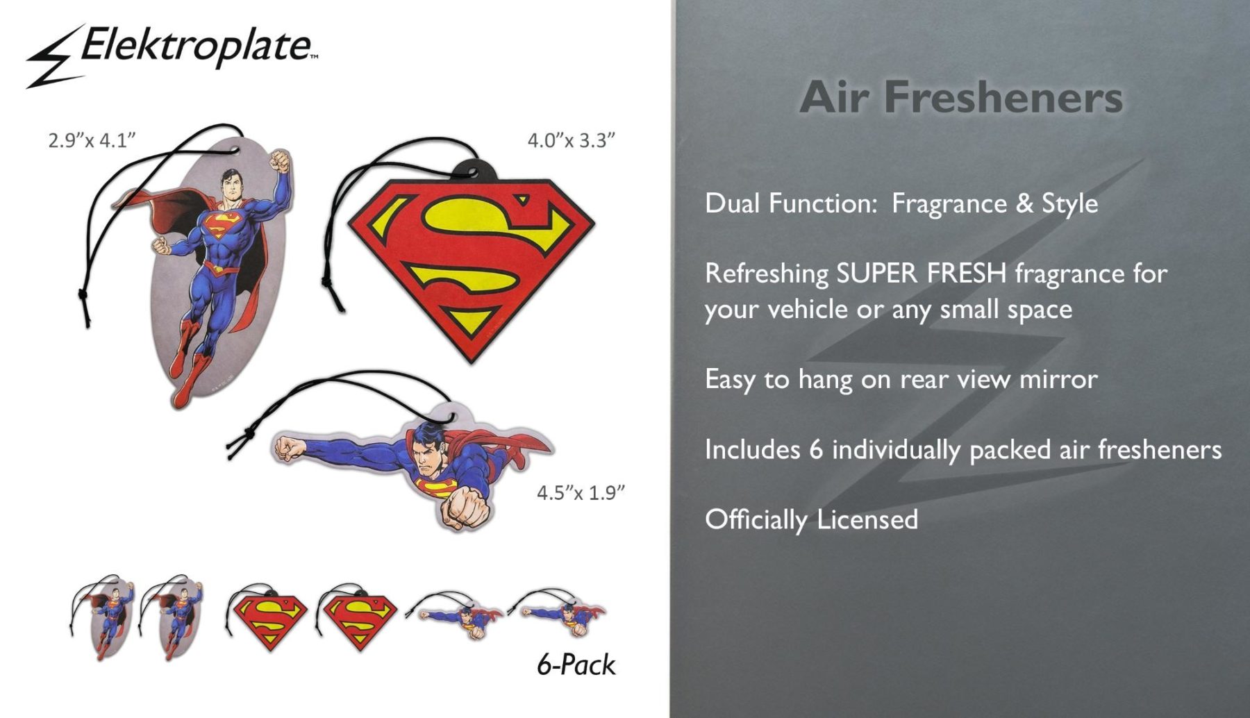 Add heroic energy to your vehicle with the Elektroplate DC Comics Superman Air Freshener 6-Pack. Featuring dynamic Superman character artwork along with the iconic logo, this officially licensed set pairs eye-catching design with a refreshing Super Fresh fragrance, blending notes of musk, sandalwood, and amber.