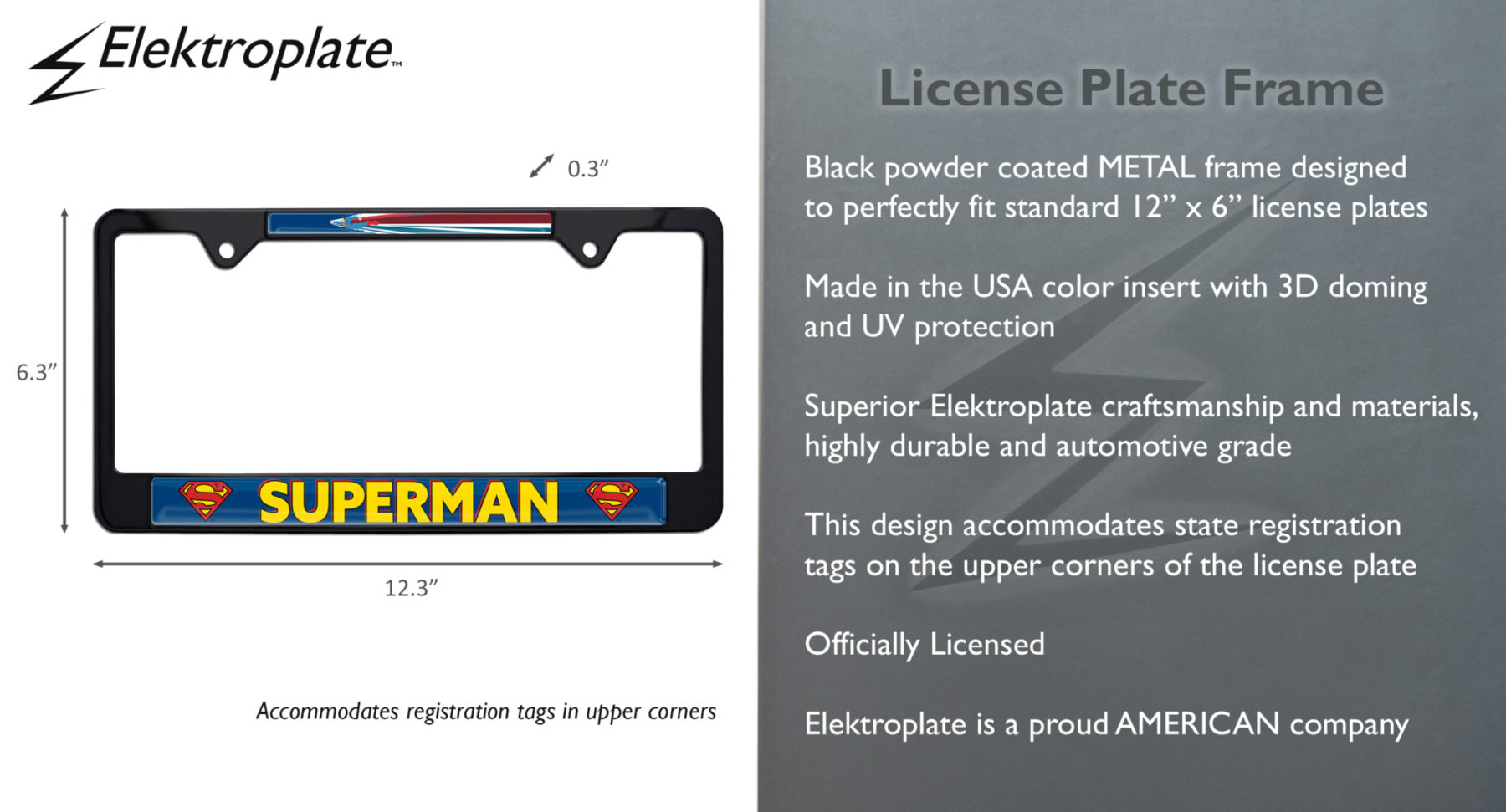 Elevate your vehicle’s style with this Officially Licensed DC Comics Superman Flying black powder coated metal license plate frame (12.3" X 6.3") by Elektroplate. This high-quality all-metal frame is built to endure the elements, ensuring it remains looking brand new for years without chipping or fading. The frame features Made in the USA graphic inserts with 3D doming, vivid colors, and UV protection.