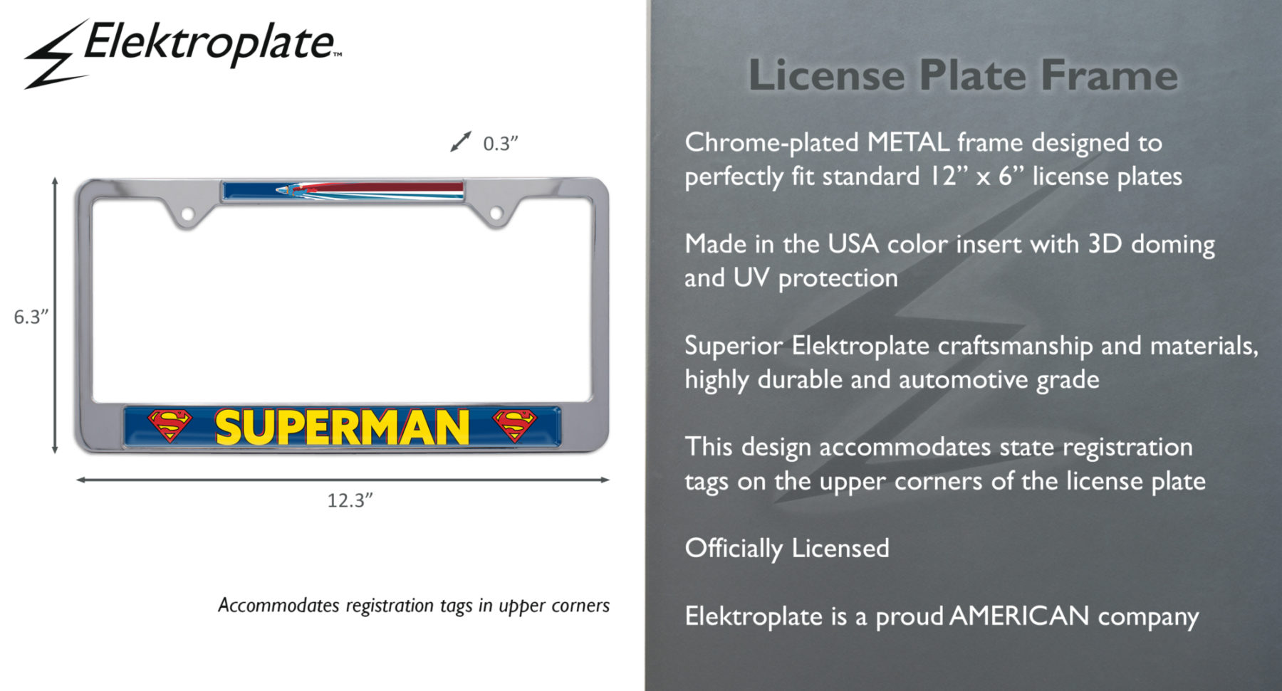 Elevate your vehicle’s style with this Officially Licensed DC Comics Superman Flying chrome-plated metal license plate frame (12.3" X 6.3") by Elektroplate. This high-quality all-metal frame is built to endure the elements, ensuring it remains looking brand new for years without chipping or fading. The frame features Made in the USA graphic inserts with 3D doming, vivid colors, and UV protection.