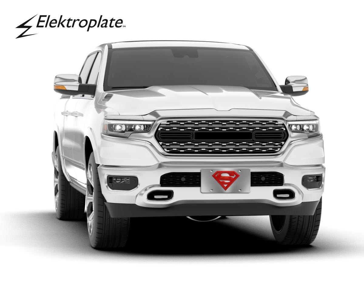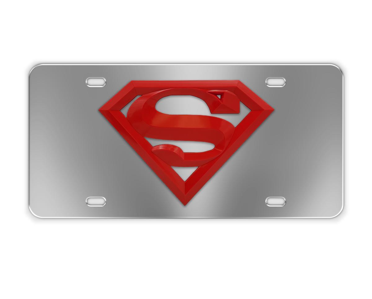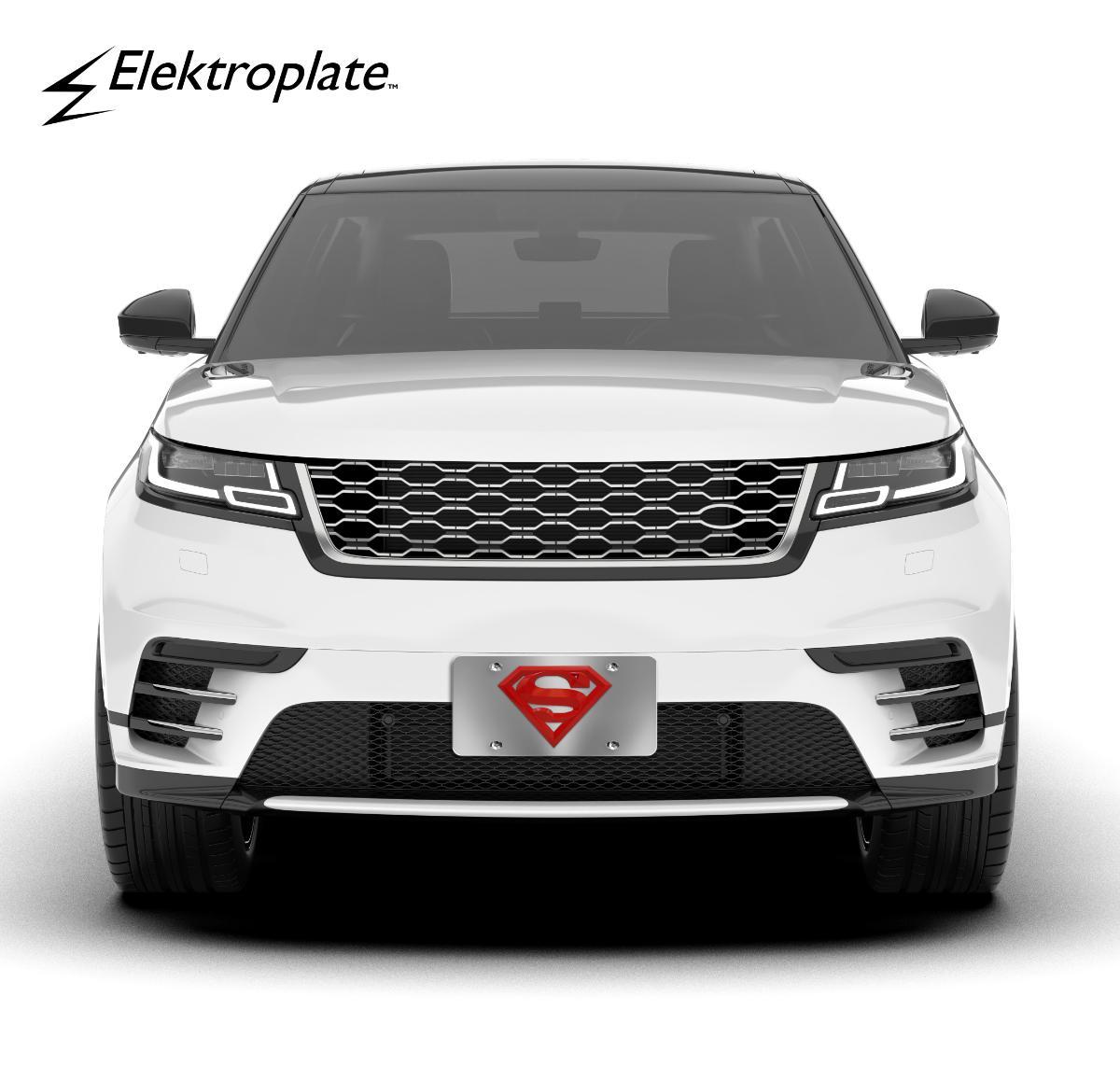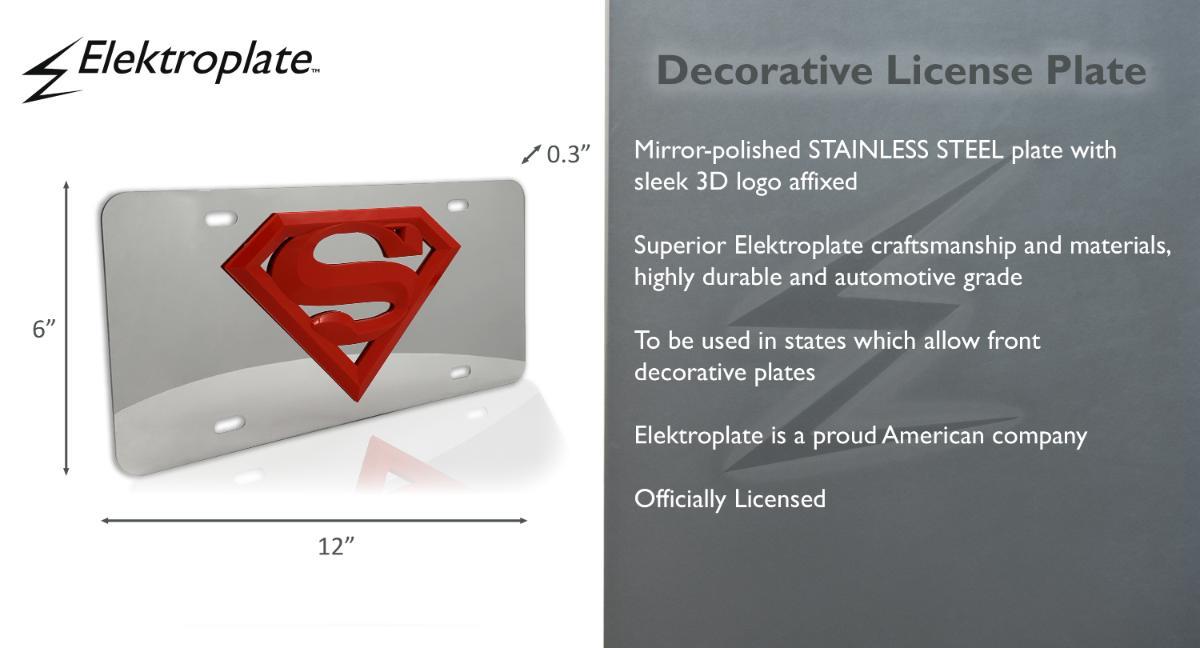 Officially licensed – Superman ALL METAL front license plate (12” x 6”) with 3D graphics by Elektroplate. Comprised of an over-sized red Superman emblem adhered to a high-grade mirror-polished stainless steel license plate base via automotive-grade durable foam tape.